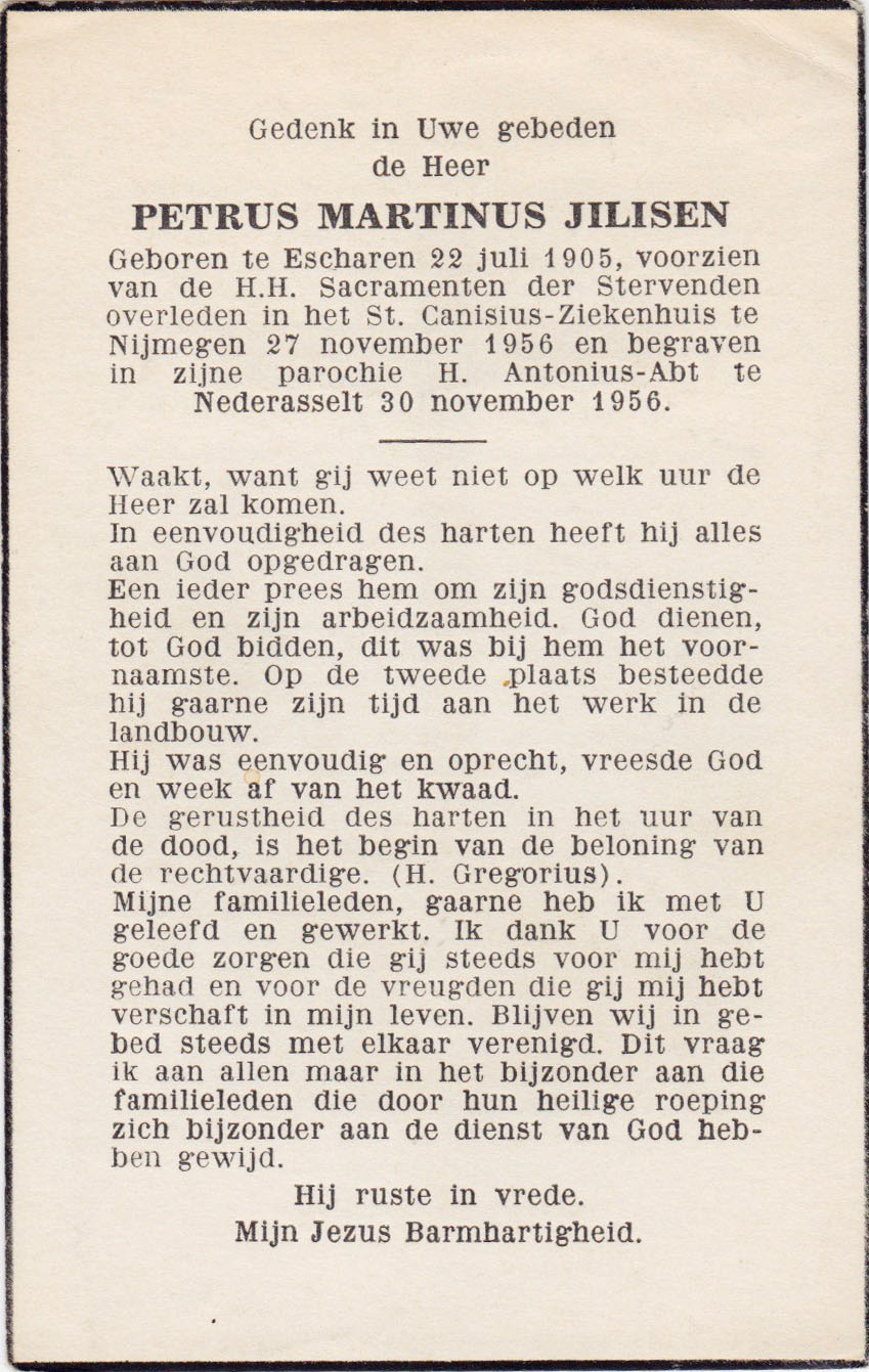 22-7-1905 27-11-1956 Jilisen, Petrus Martinus Doopnamen: Petrus Martinus Achternaam: Jilisen Geboren: 22-7-1905, Escharen Overleden: 27-11-1956, Nijmegen Leeftijd: 51 Begrafenis/crematie te: Nederasselt Archiefnummer: 16-10-3 Terug