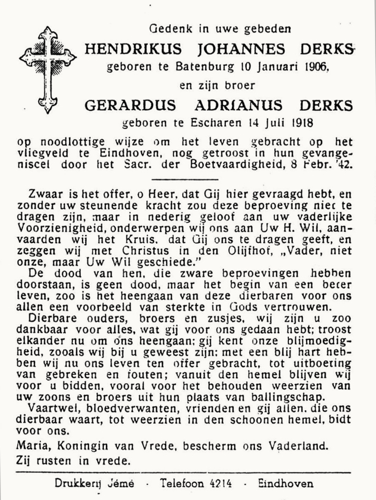14-7-1918 8-2-1942 Derks, Gerardus Adrianus Doopnamen: Gerardus Adrianus Achternaam: Derks Geboren: 14-7-1918, Escharen Overleden: 8-2-1942, Eindhoven Leeftijd: 23 Begrafenis/crematie te: Osnabrück Archiefnummer: 16-11-3 k