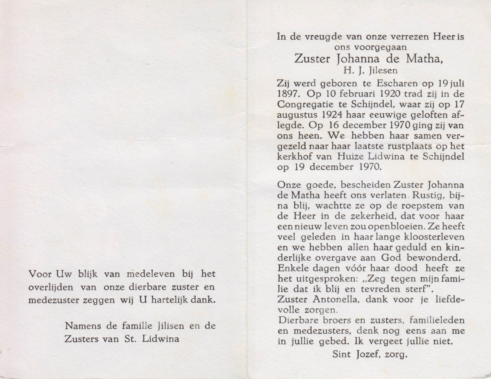 19-7-1897 16-12-1970 Jilesen, Hendrika Johanna Doopnamen: Hendrika Johanna Roepnaam: Zuster Johanna de Matha Achternaam: Jilesen Geboren: 19-7-1897, Escharen Overleden: 16-12-1970, Schijndel Leeftijd: 73 Archiefnummer: 16-14-1
