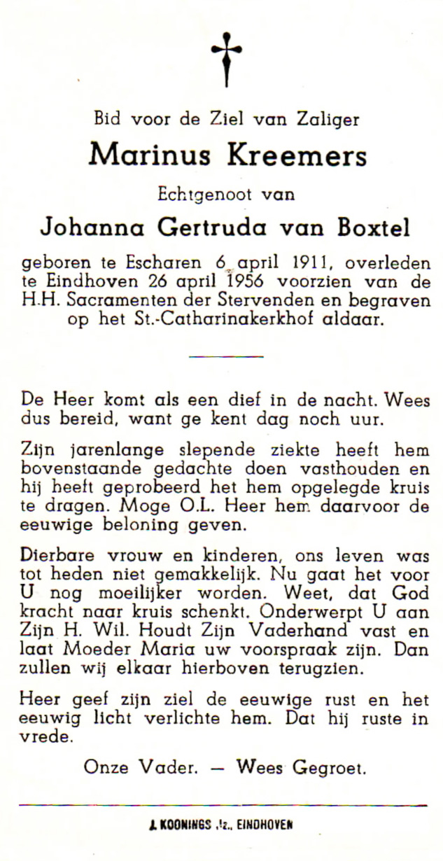 6-4-1911 26-4-1956 Kreemers, Marinus Doopnamen: Marinus Achternaam: Kreemers Geboren: 6-4-1911, Escharen Overleden: 26-4-1956, Eindhoven Leeftijd: 45 Begrafenis/crematie te: Eindhoven Partner van: Johanna Gertruda van Boxtel Archiefnummer: 16-15-6
