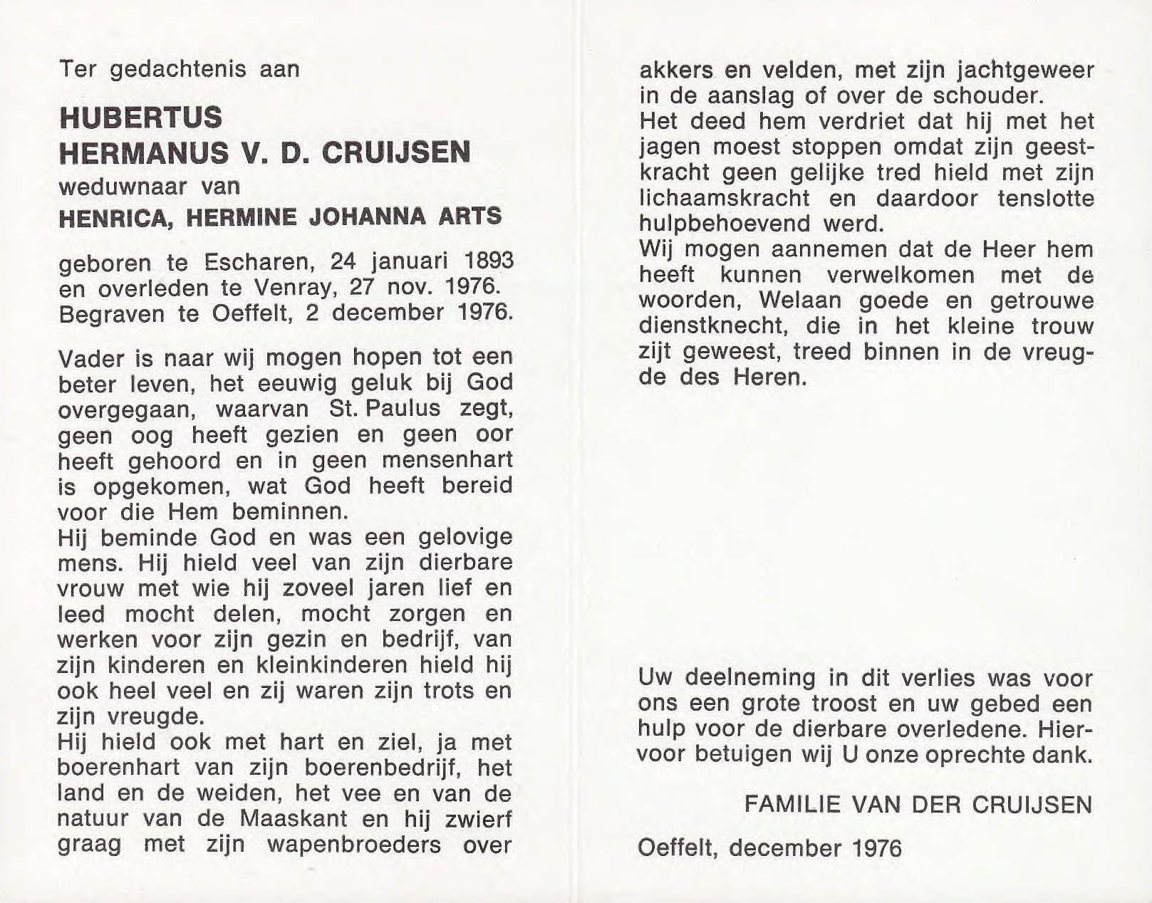 24-1-1893 27-11-1976 Cruijsen, Hubertus Hermanus van der Doopnamen: Hubertus Hermanus Achternaam: van der Cruijsen Geboren: 24-1-1893, Escharen Overleden: 27-11-1976, Venray Leeftijd: 83 Begrafenis/crematie te: Oeffelt Partner van: Henrica Hermine Johanna Arts Archiefnummer: 16-16-5