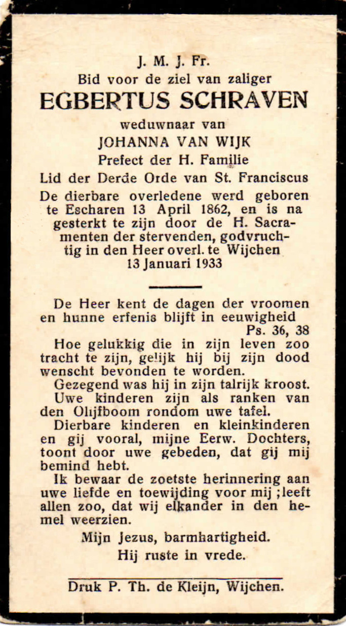 13-4-1862 13-1-1933 Schraven, Egbertus Doopnamen: Egbertus Achternaam: Schraven Geboren: 13-4-1862, Escharen Overleden: 13-1-1933, Wijchen Leeftijd: 70 Partner van: Johanna van Wijk Archiefnummer: 16-19-4