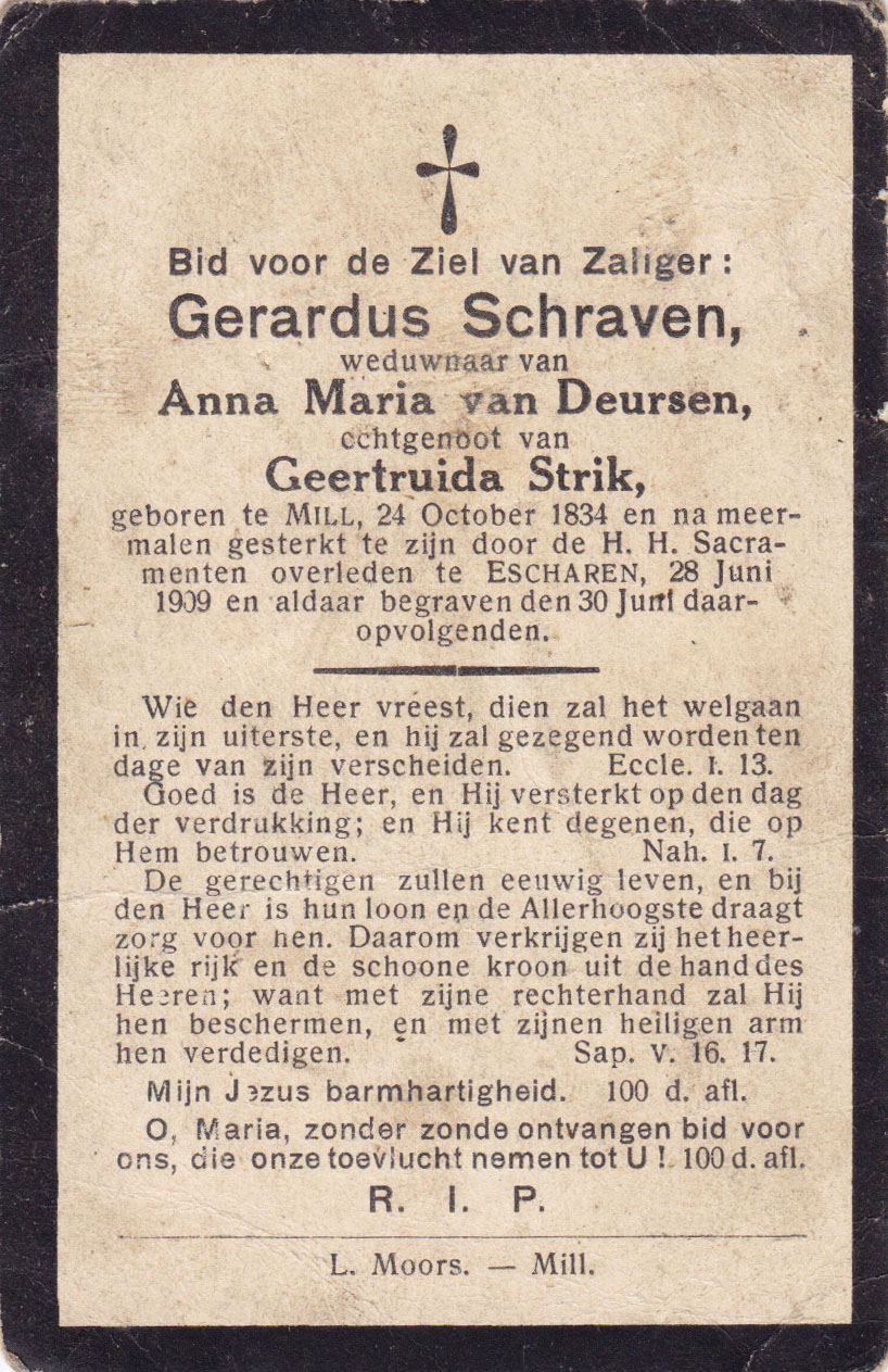 24-10-1834 28-6-1909 Schraven, Gerardus Doopnamen: Gerardus Achternaam: Schraven Geboren: 24-10-1834, Mill Overleden: 28-6-1909, Escharen Leeftijd: 74 Begrafenis/crematie te: Escharen Partner van: Anna Maria van Deursen Eerder gehuwd met: Geertruida Strik Archiefnummer: 16-2-5 k