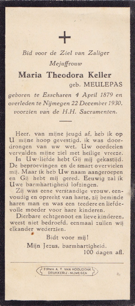 4-4-1879 22-12-1930 Meulepas, Maria Theodora Doopnamen: Maria Theodora Achternaam: Meulepas Geboren: 4-4-1879, Escharen Overleden: 22-12-1930, Nijmegen Leeftijd: 51 Partner van: Keller Archiefnummer: 16-28-4 k Terug
