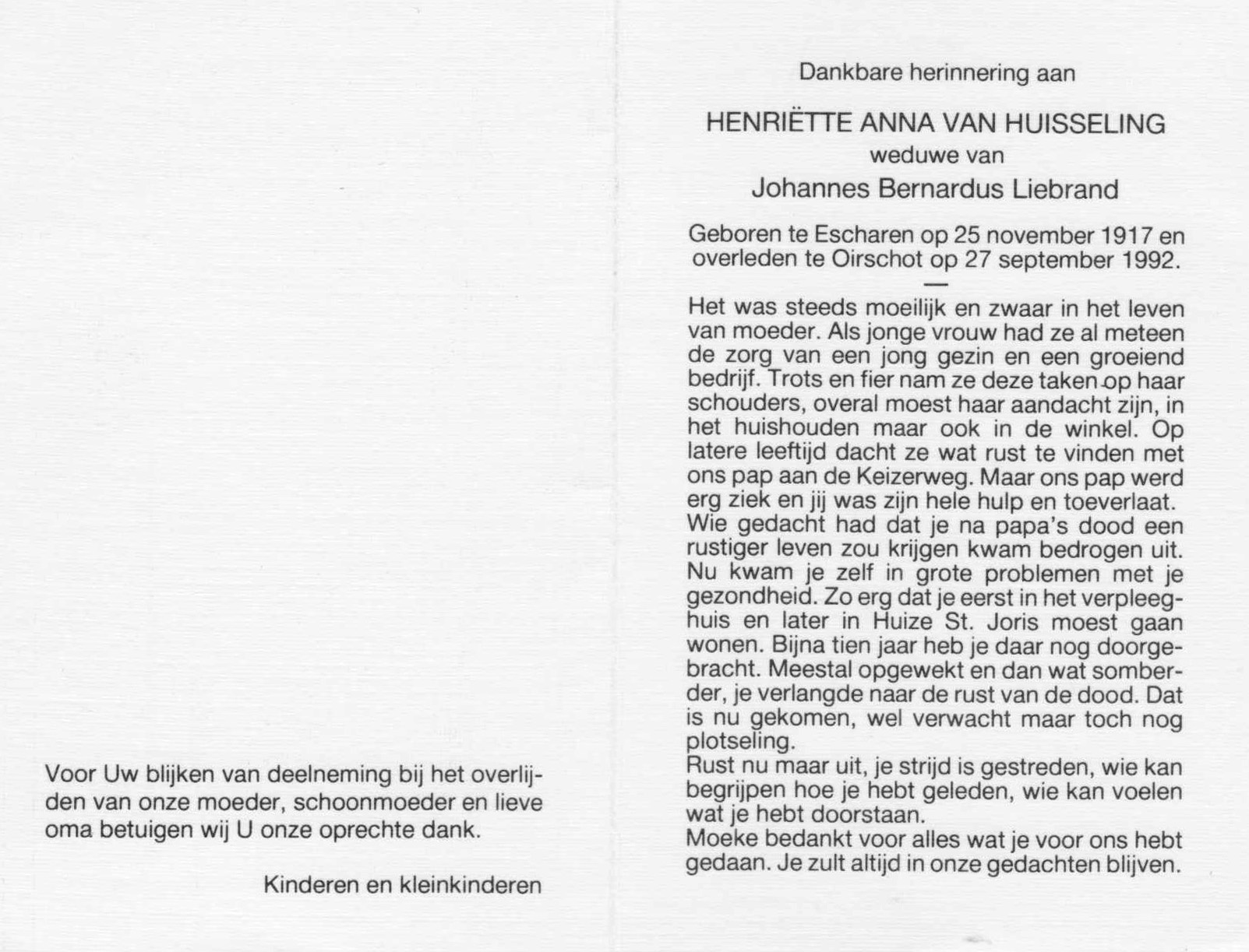 25-11-1917 27-9-1992 Huisseling, Henriëtte Anna van Doopnamen: Henriëtte Anna Achternaam: van Huisseling Geboren: 25-11-1917, Escharen Overleden: 27-9-1992, Oirschot Leeftijd: 74 Partner van: Johannes B. Liebrand Archiefnummer: 16-29-4