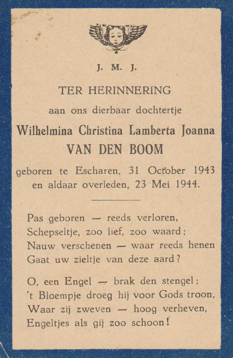 31-10-1943 23-5-1944 Boom, Wilhelmina Christina L.J. van den Doopnamen: Wilhelmina Christina L.J. Achternaam: van den Boom Geboren: 31-10-1943, Escharen Overleden: 23-5-1944, Escharen Archiefnummer: 16-31-2 k