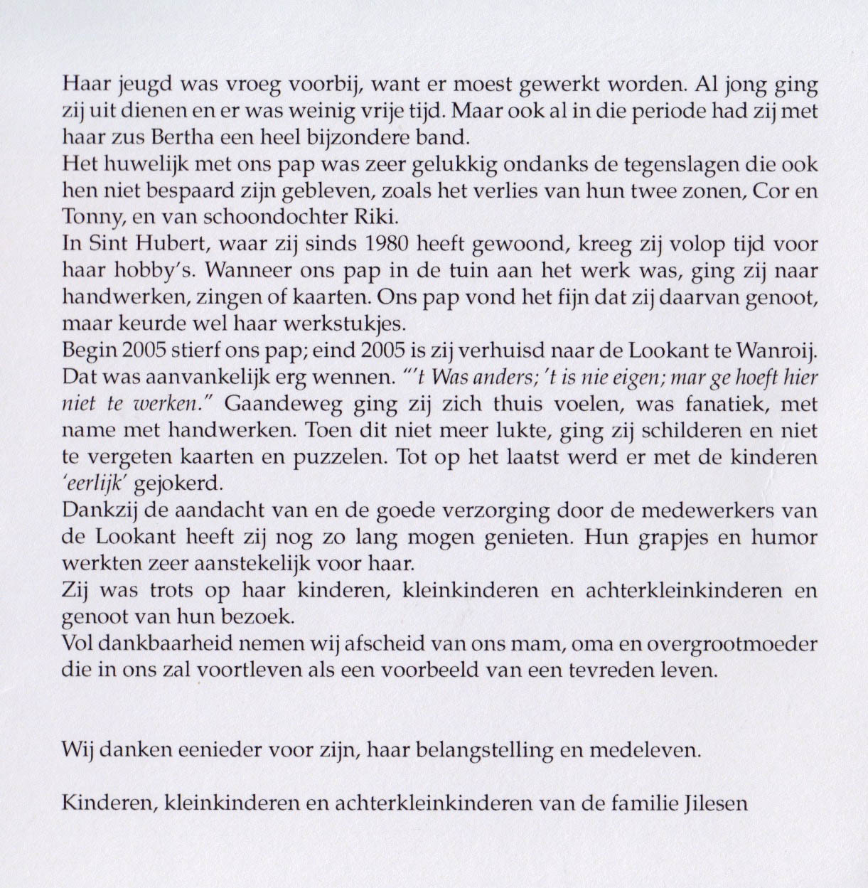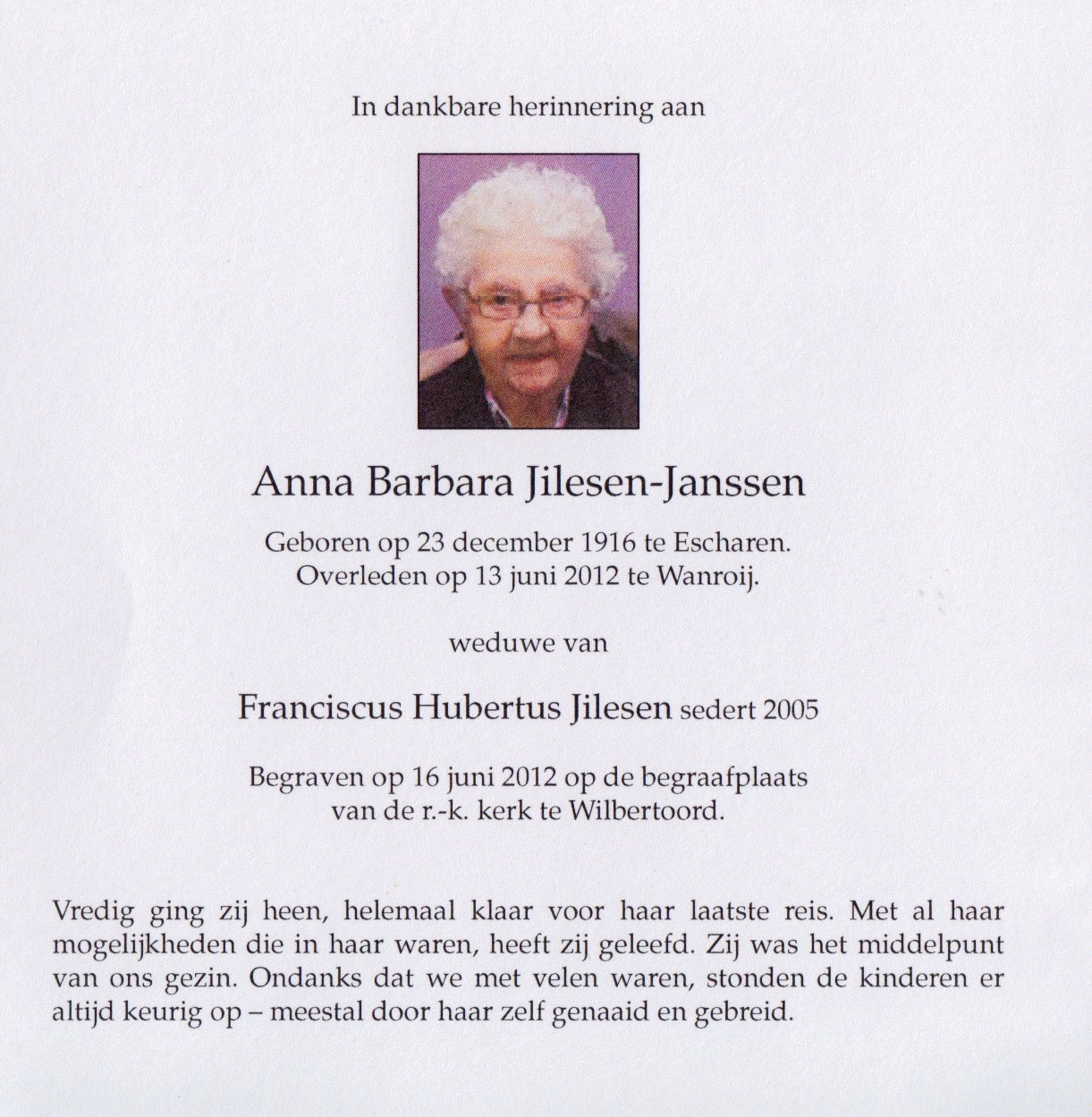 23-12-1916 13-6-2012 Janssen, Anna Barbara Doopnamen: Anna Barbara Achternaam: Janssen Geboren: 23-12-1916, Escharen Overleden: 13-6-2012, Wanroij Leeftijd: 95 Begrafenis/crematie te: Wilbertoord Partner van: Franciscus H. Jilesen Archiefnummer: 16-4-3 Terug