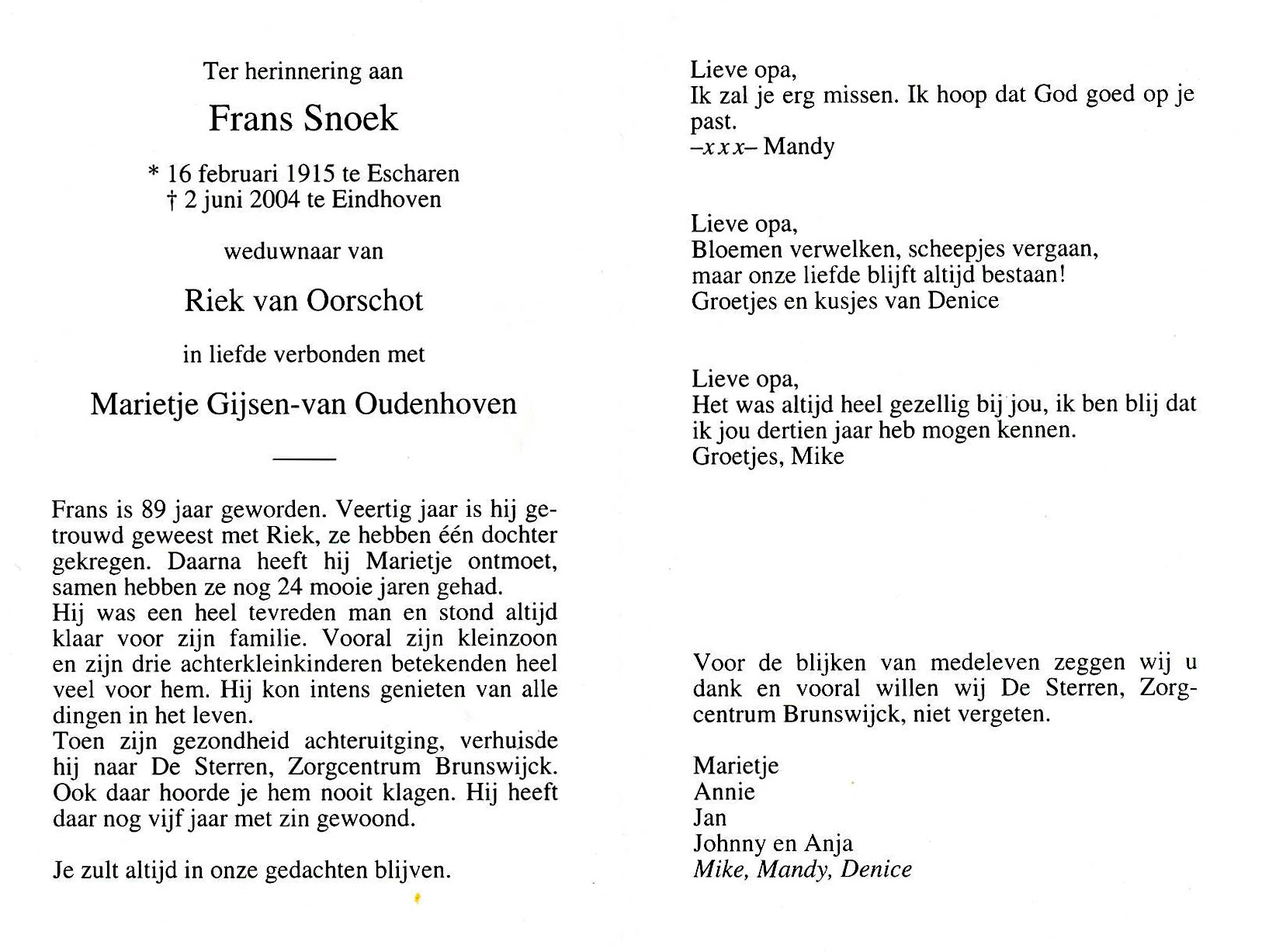 16-2-1915 2-6-2004 Snoek, Frans Doopnamen: Frans Achternaam: Snoek Geboren: 16-2-1915, Escharen Overleden: 2-6-2004, Eindhoven Leeftijd: 89 Partner van: Marietje Gijsen- van Oudenhoven Eerder gehuwd met: Riek van Oorschot Archiefnummer: 17-15-3 k