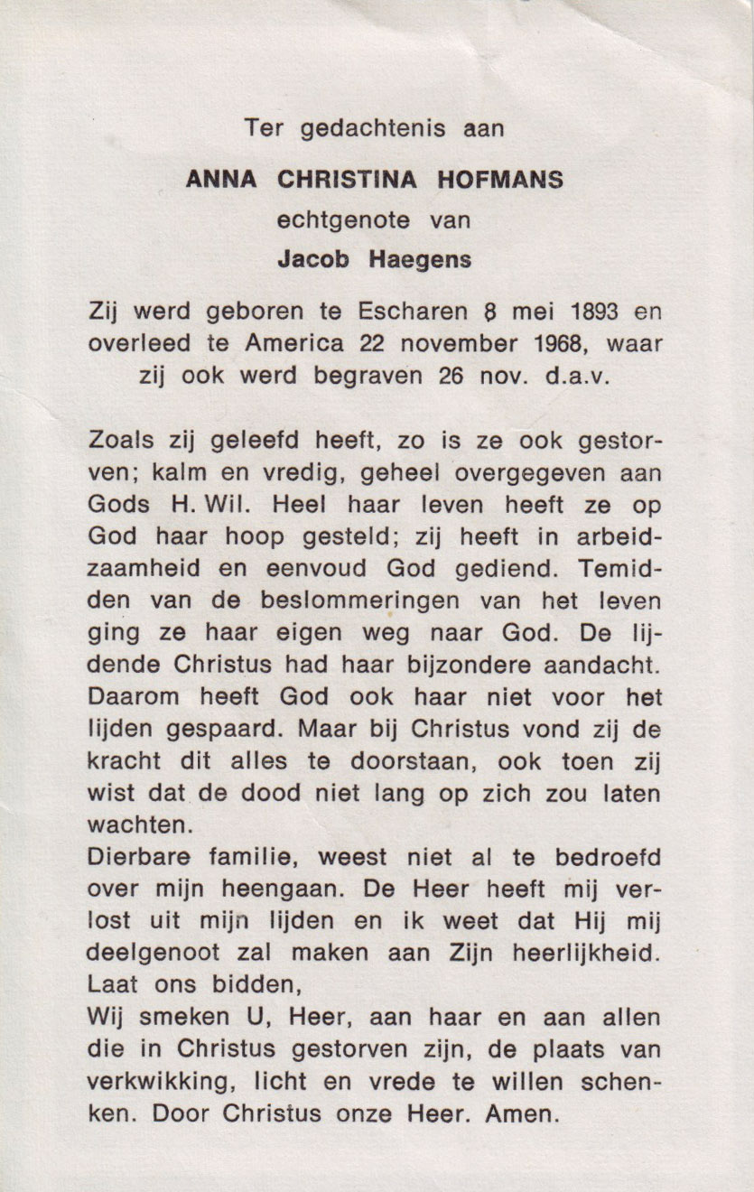 8-5-1893 22-11-1968 Hofmans, Anna Christina Doopnamen: Anna Christina Achternaam: Hofmans Geboren: 8-5-1893, Escharen Overleden: 22-11-1968, America Leeftijd: 75 Partner van: Jacob Haegens Archiefnummer: 17-17-6