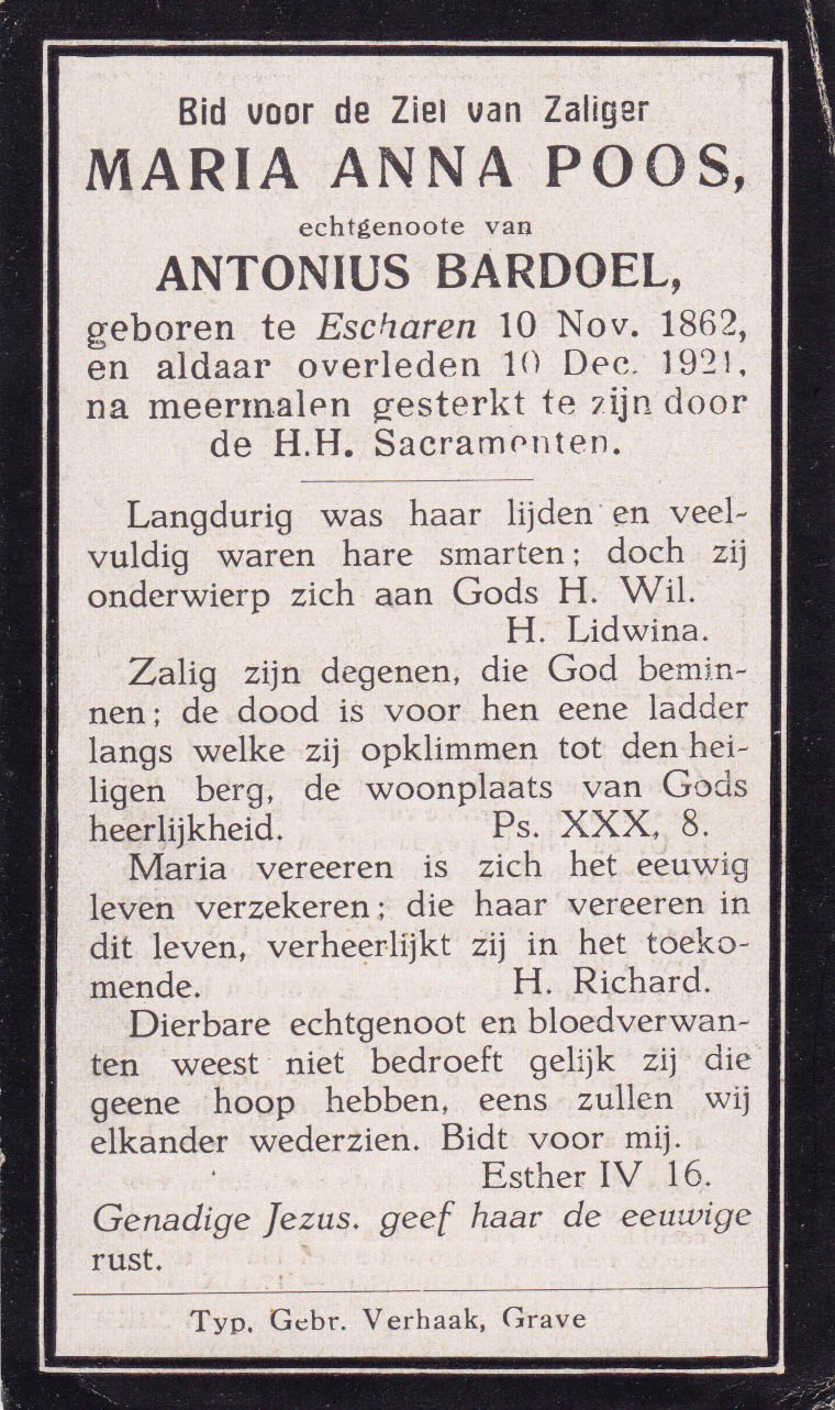 10-11-1862 10-12-1862 Poos, Maria Anna Doopnamen: Maria Anna Achternaam: Poos Geboren: 10-11-1862, Escharen Overleden: 10-12-1862, Escharen Partner van: Antonius Bardoel Archiefnummer: 17-22-4