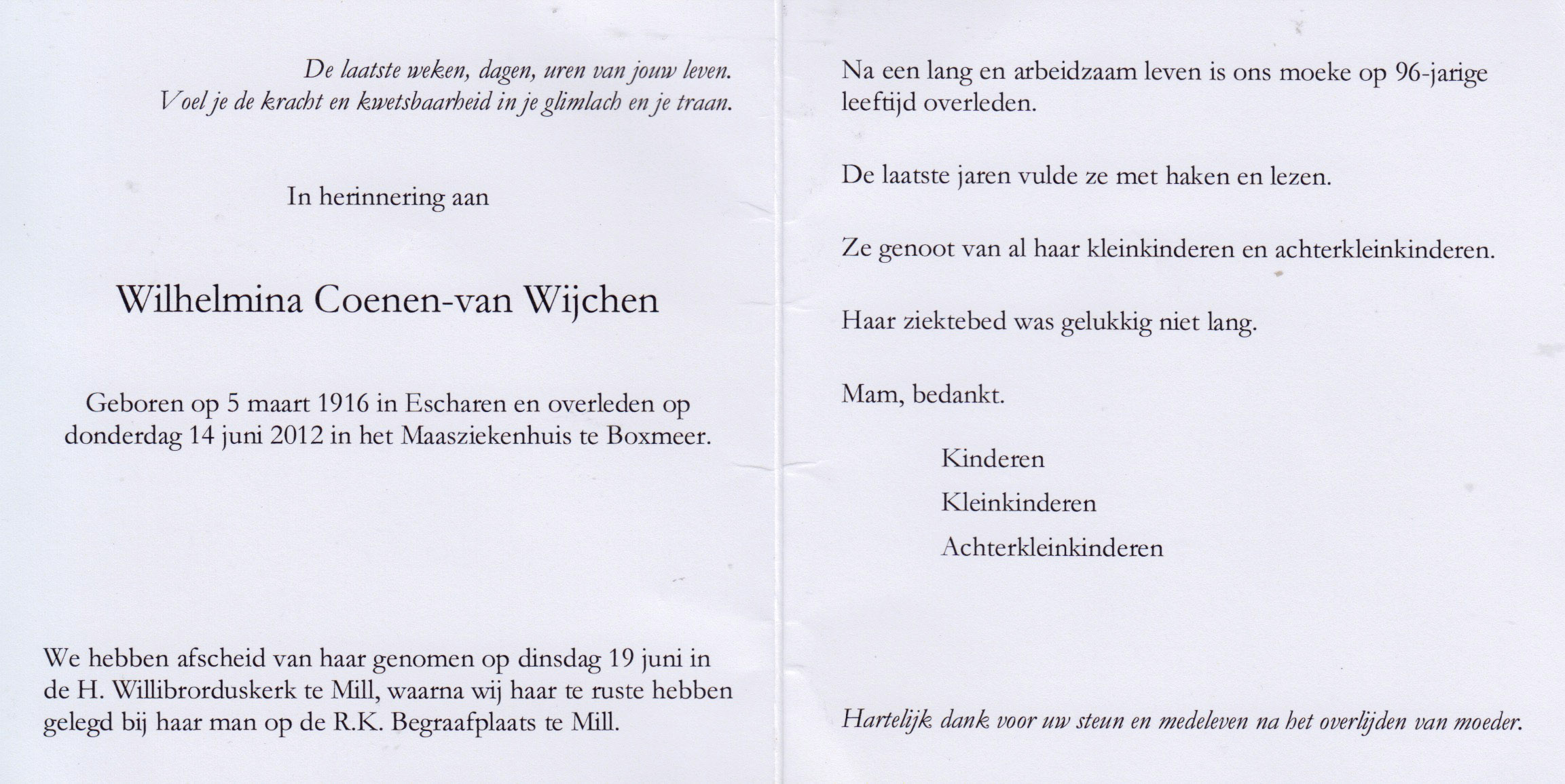 5-3-1916 14-6-2012 Wijchen, Wilhelmina van Doopnamen: Wilhelmina Achternaam: van Wijchen Geboren: 5-3-1916, Escharen Overleden: 14-6-2012, Boxmeer Leeftijd: 96 Begrafenis/crematie te: Mill Partner van: Coenen Archiefnummer: 17-24-1