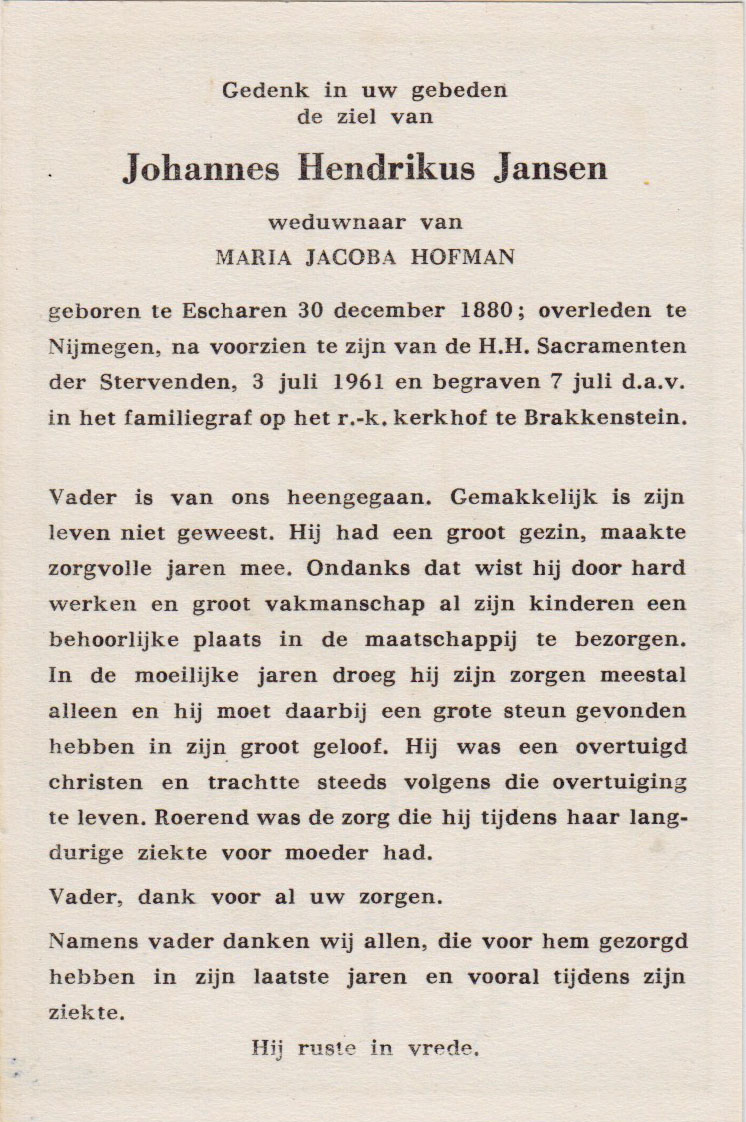 30-12-1880 3-7-1961 Jansen, Johannes Hendrikus Doopnamen: Johannes Hendrikus Achternaam: Jansen Geboren: 30-12-1880, Escharen Overleden: 3-7-1961, Nijmegen Leeftijd: 80 Partner van: Maria Jacoba Hofman Archiefnummer: 18-3-1 Terug