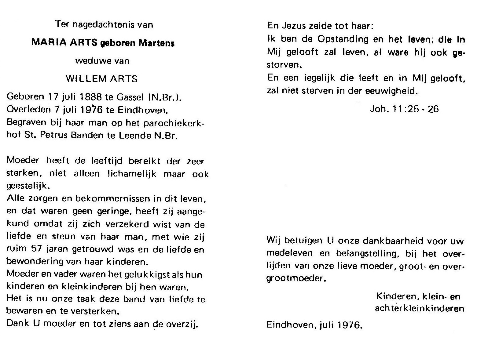17-7-1888 7-7-1976 Martens, Maria Doopnamen: Maria Achternaam: Martens Geboren: 17-7-1888, Gassel Overleden: 7-7-1976, Eindhoven Leeftijd: 87 Begrafenis/crematie te: Leende Partner van: Willem Arts Archiefnummer: 18-34-1 k