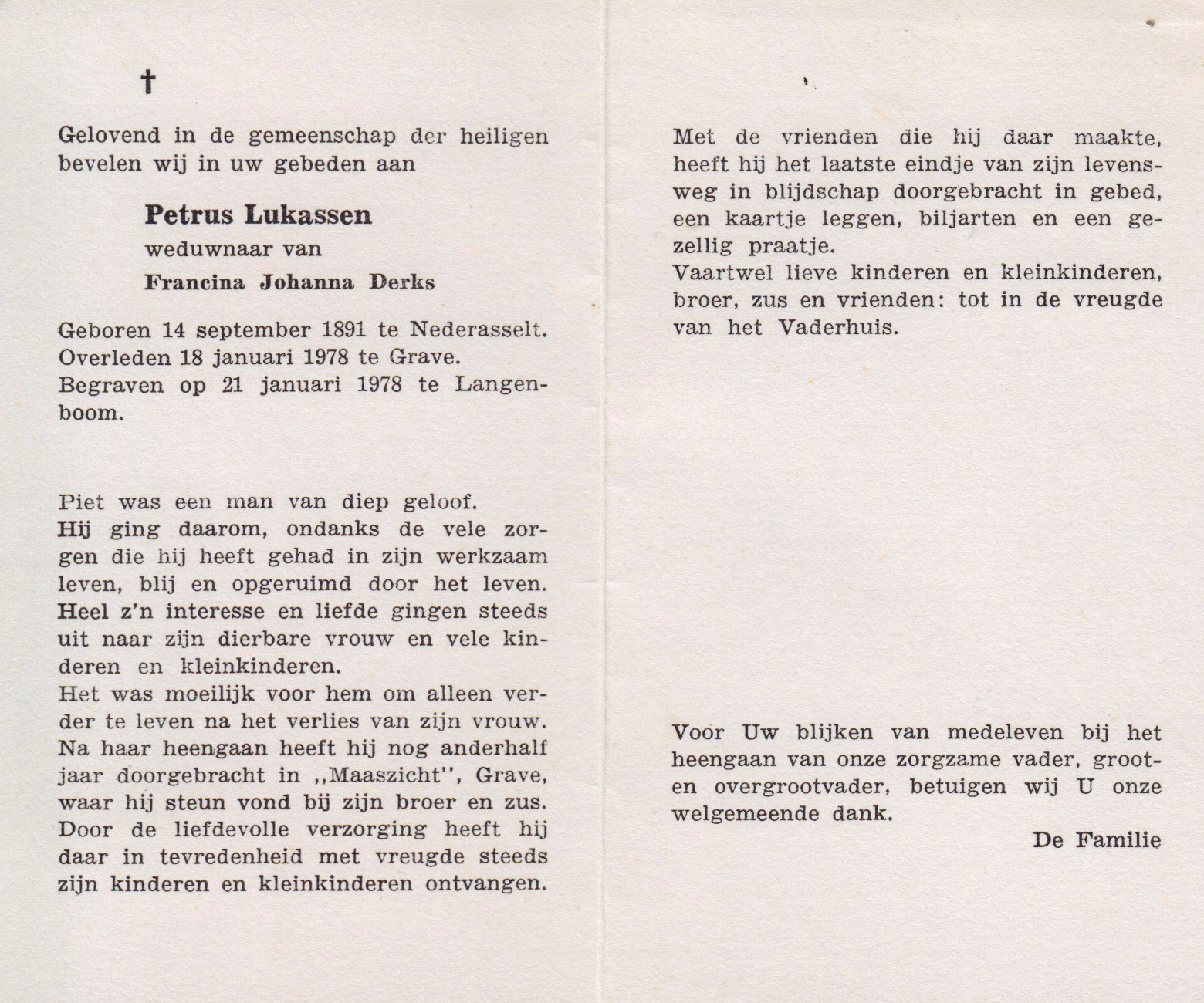 14-9-1891 21-1-1978 Lukassen, Petrus Doopnamen: Petrus Achternaam: Lukassen Geboren: 14-9-1891, Nederasselt Overleden: 21-1-1978, Langenboom Leeftijd: 86 Partner van: Francina J. Derks Archiefnummer: 18-6-4