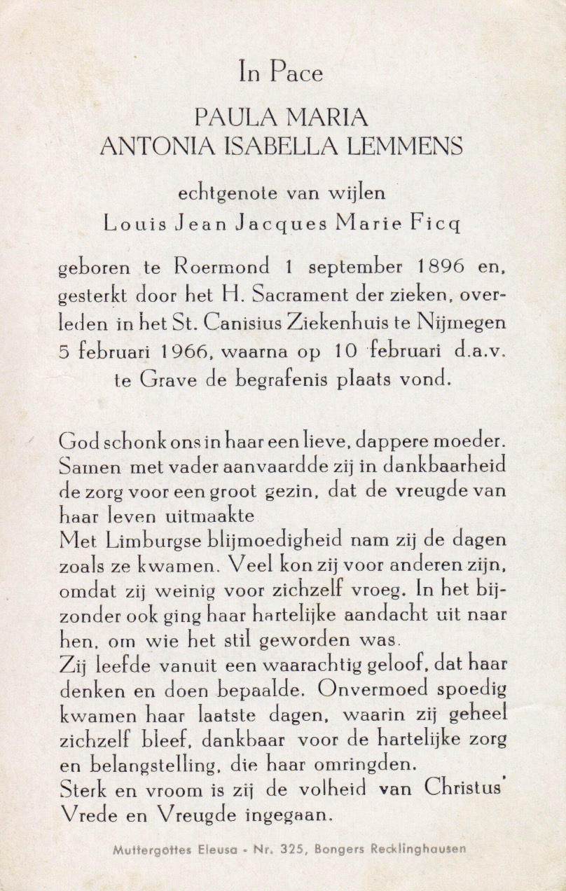 1-9-1896 5-2-1966 Lemmens, Paula Maria Antonia Doopnamen: Paula Maria Antonia Achternaam: Lemmens Geboren: 1-9-1896, Roermond Overleden: 5-2-1966, Nijmegen Leeftijd: 69 Begrafenis/crematie te: Grave Partner van: Louis Ficq Archiefnummer: 19-12-5