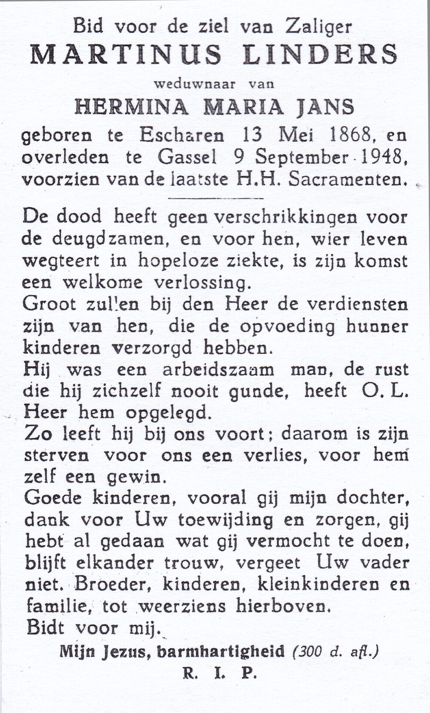 13-5-1868 9-9-1948 Linders, Martinus Doopnamen: Martinus Achternaam: Linders Geboren: 13-5-1868, Escharen Overleden: 9-9-1948, Gassel Leeftijd: 80 Partner van: Hermina M. Jans Archiefnummer: 19-12-6 k