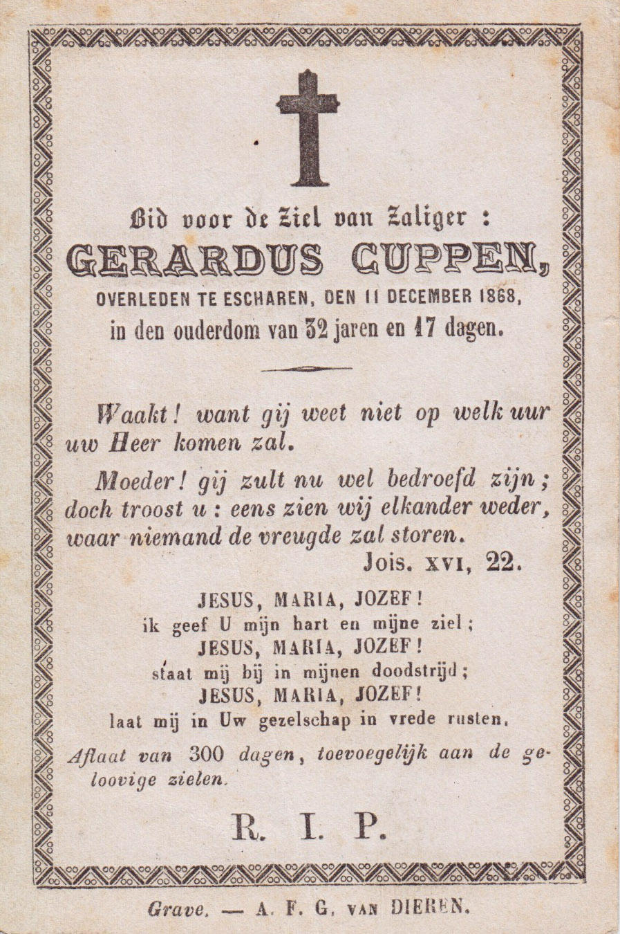 23-11-1836 11-12-1868 Cuppen, Gerardus Doopnamen: Gerardus Achternaam: Cuppen Geboren: 23-11-1836, Escharen Overleden: 11-12-1868, Escharen Leeftijd: 32 Archiefnummer: 19-27-6