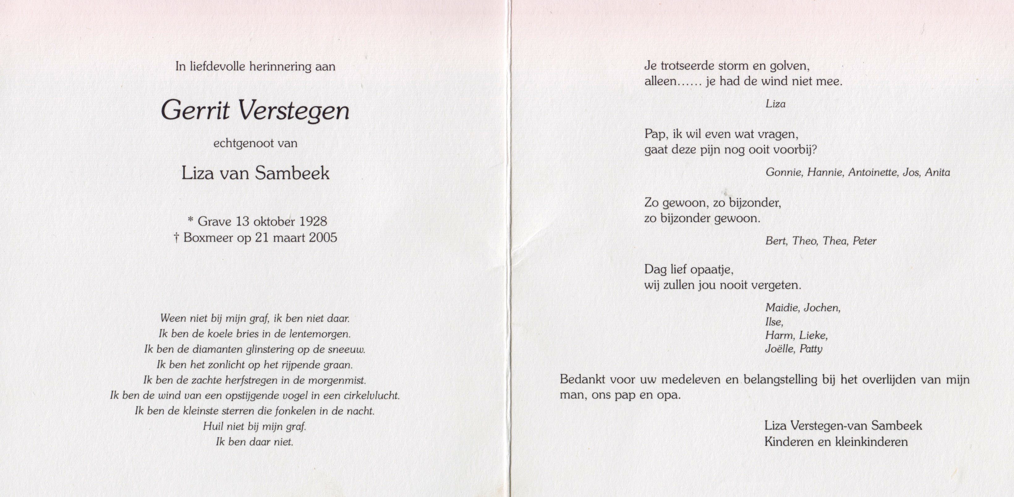13-10-1928 21-3-2005 Verstegen, Gerrit Doopnamen: Gerrit Achternaam: Verstegen Geboren: 13-10-1928, Escharen Overleden: 21-3-2005, Boxmeer Leeftijd: 76 Partner van: Liza van Sambeek Archiefnummer: 19-5-3