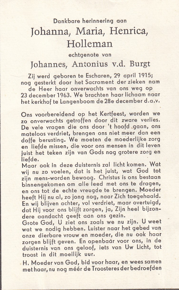 29-4-1915 23-12-1963 Holleman, Johanna Maria Henrica Doopnamen: Johanna Maria Henrica Achternaam: Holleman Geboren: 29-4-1915, Escharen Overleden: 23-12-1963, Langenboom Leeftijd: 48 Begrafenis/crematie te: Langenboom Partner van: Johannes A. van der Burgt Archiefnummer: 2-11-6
