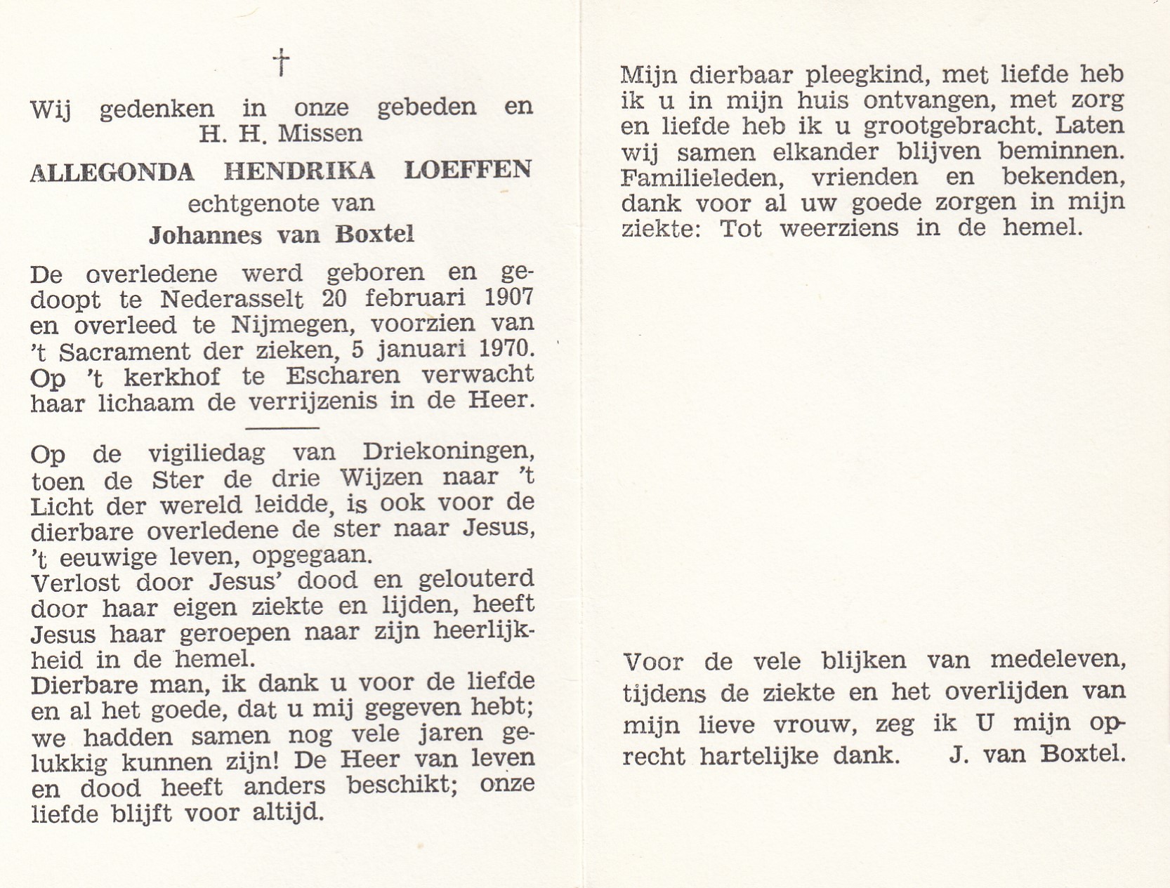 20-2-1907 5-1-1970 Loeffen, Allegonda Hendrika Doopnamen: Allegonda Hendrika Achternaam: Loeffen Geboren: 20-2-1907, Nederasselt Overleden: 5-1-1970, Nijmegen Leeftijd: 62 Begrafenis/crematie te: Escharen Partner van: Johannes van Boxtel Archiefnummer: 2-12-4 Terug
