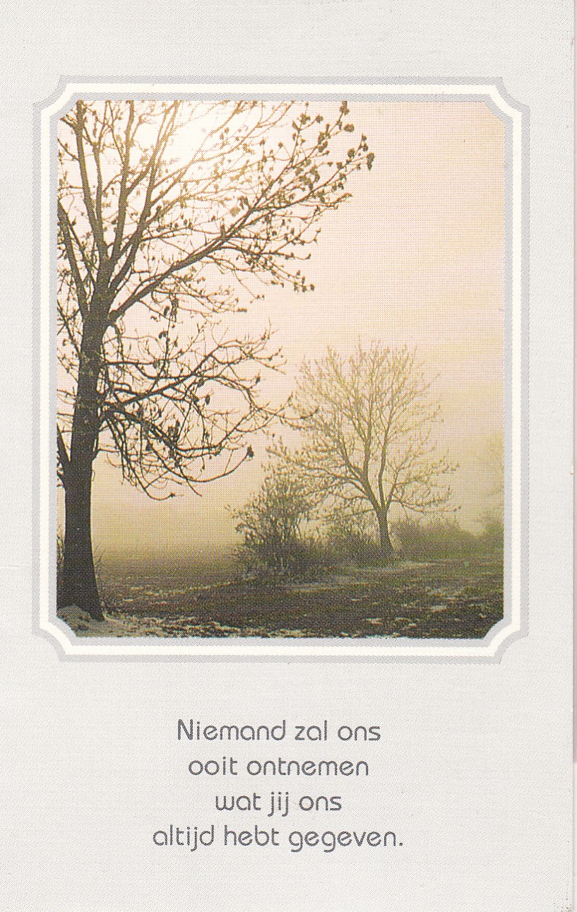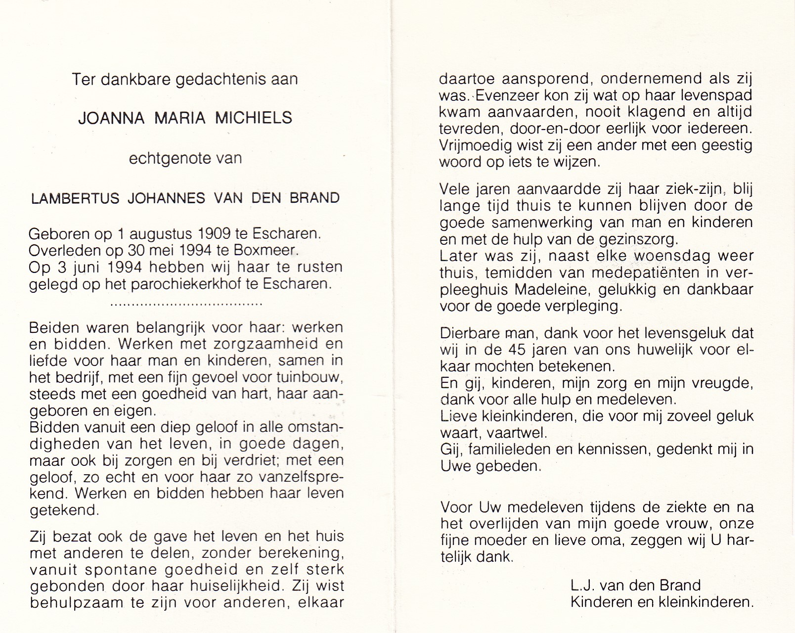 1-8-1909 30-5-1994 Michiels, Joanna Maria Doopnamen: Joanna Maria Achternaam: Michiels Geboren: 1-8-1909, Escharen Overleden: 30-5-1994, Boxmeer Leeftijd: 84 Begrafenis/crematie te: Escharen Partner van: Lambertus J. van den Brand Archiefnummer: 2-12-6 Terug