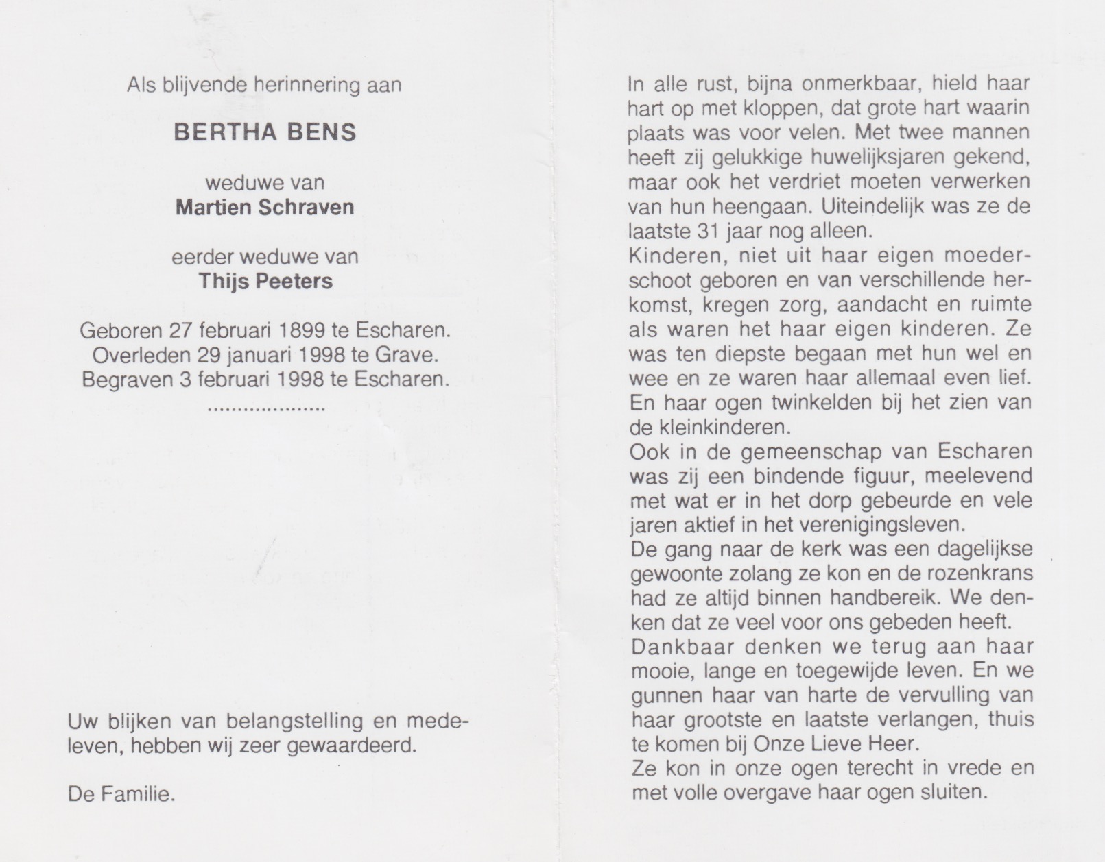 27-2-1899 29-1-1998 Bens, Bernardina Wilhelmina Doopnamen: Bernardina Wilhelmina Roepnaam: Bertha Achternaam: Bens Geboren: 27-2-1899, Escharen Overleden: 29-1-1998, Grave Leeftijd: 98 Begrafenis/crematie te: Escharen Partner van: Martien Schraven Eerder gehuwd met: Mathijs Peeters Archiefnummer: 2-17-4 Terug