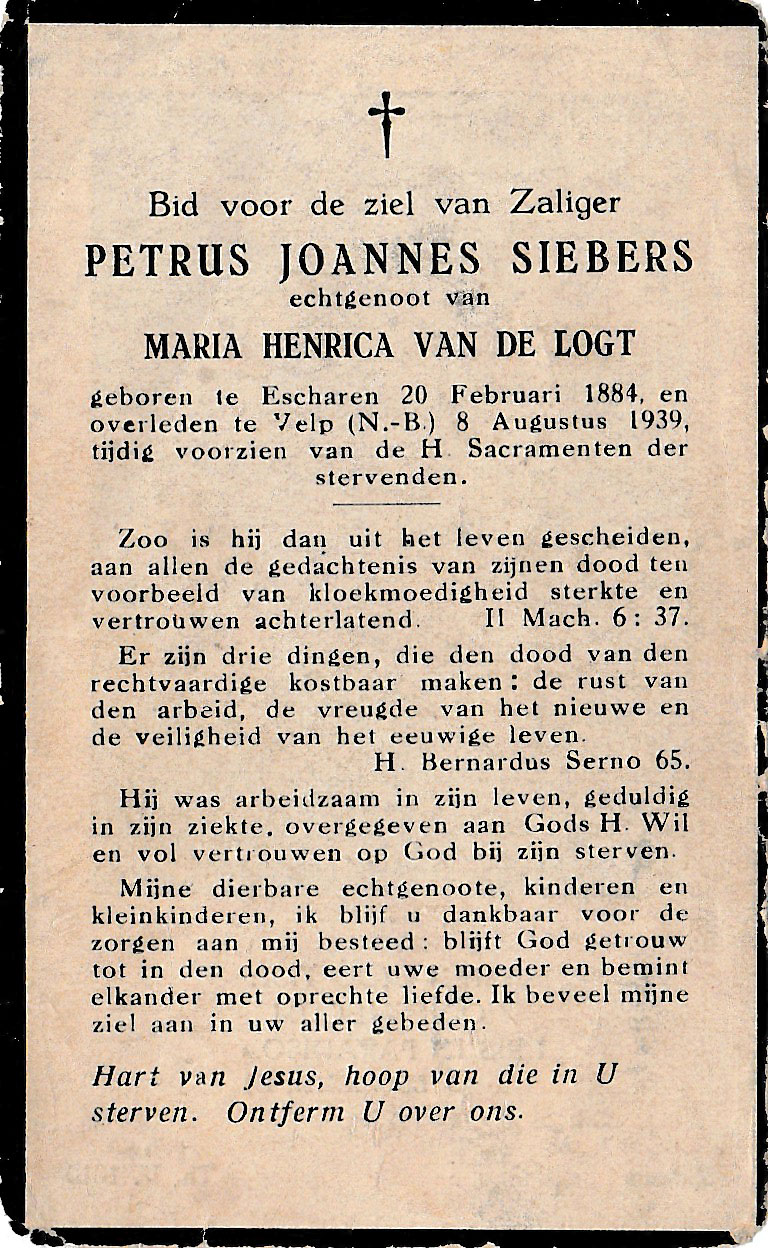 20-2-1884 8-8-1939 Siebers, Petrus Joannes Doopnamen: Petrus Joannes Achternaam: Siebers Geboren: 20-2-1884, Escharen Overleden: 8-8-1939, Velp Leeftijd: 55 Begrafenis/crematie te: Velp Partner van: Maria Henrica van de Logt Archiefnummer: 2-18-1