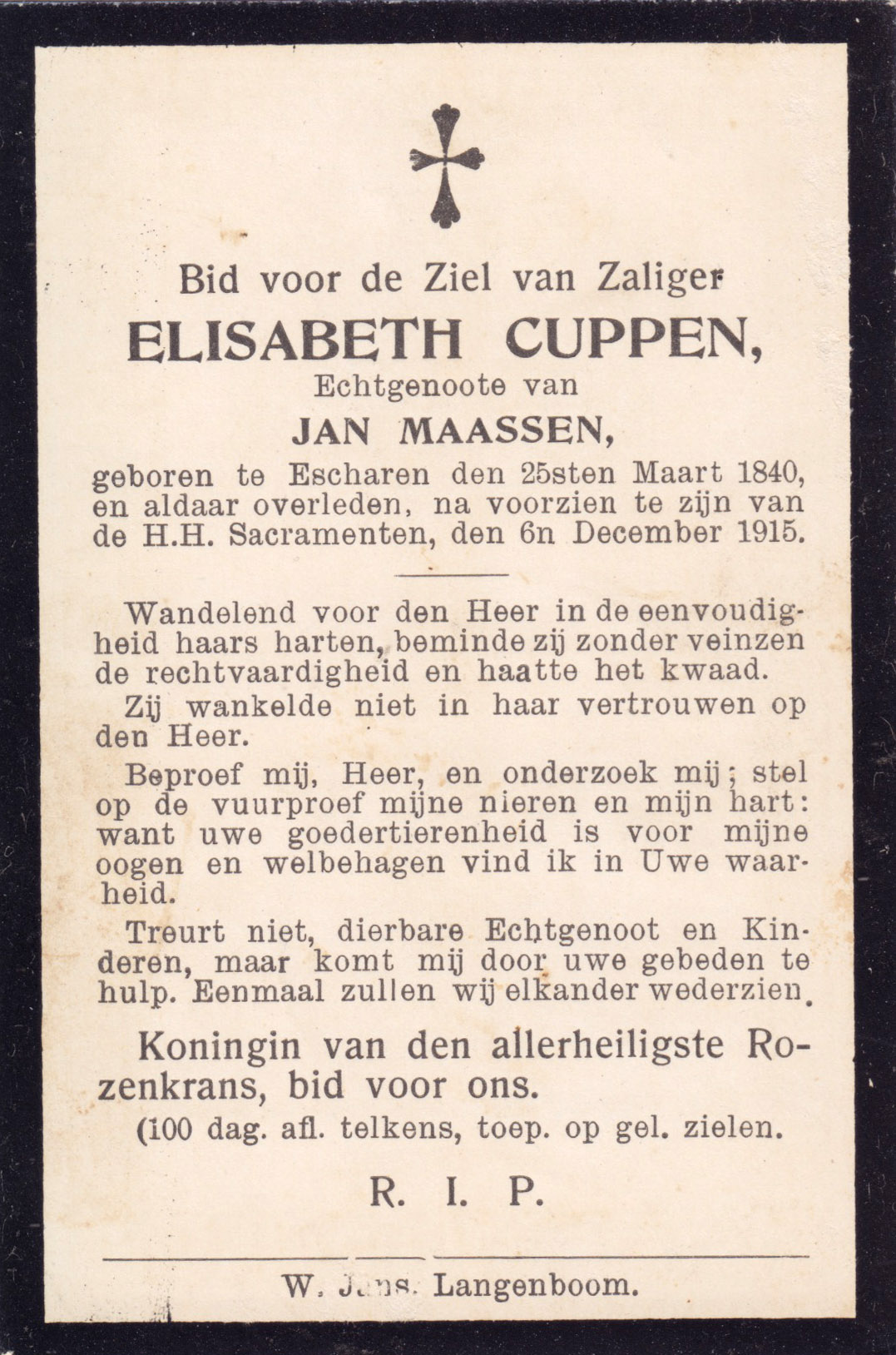 25-3-1840 6-12-1915 Cuppen, Elisabeth Doopnamen: Elisabeth Achternaam: Cuppen Geboren: 25-3-1840, Escharen Overleden: 6-12-1915, Escharen Leeftijd: 75 Partner van: Jan Maassen Archiefnummer: 20-1-4