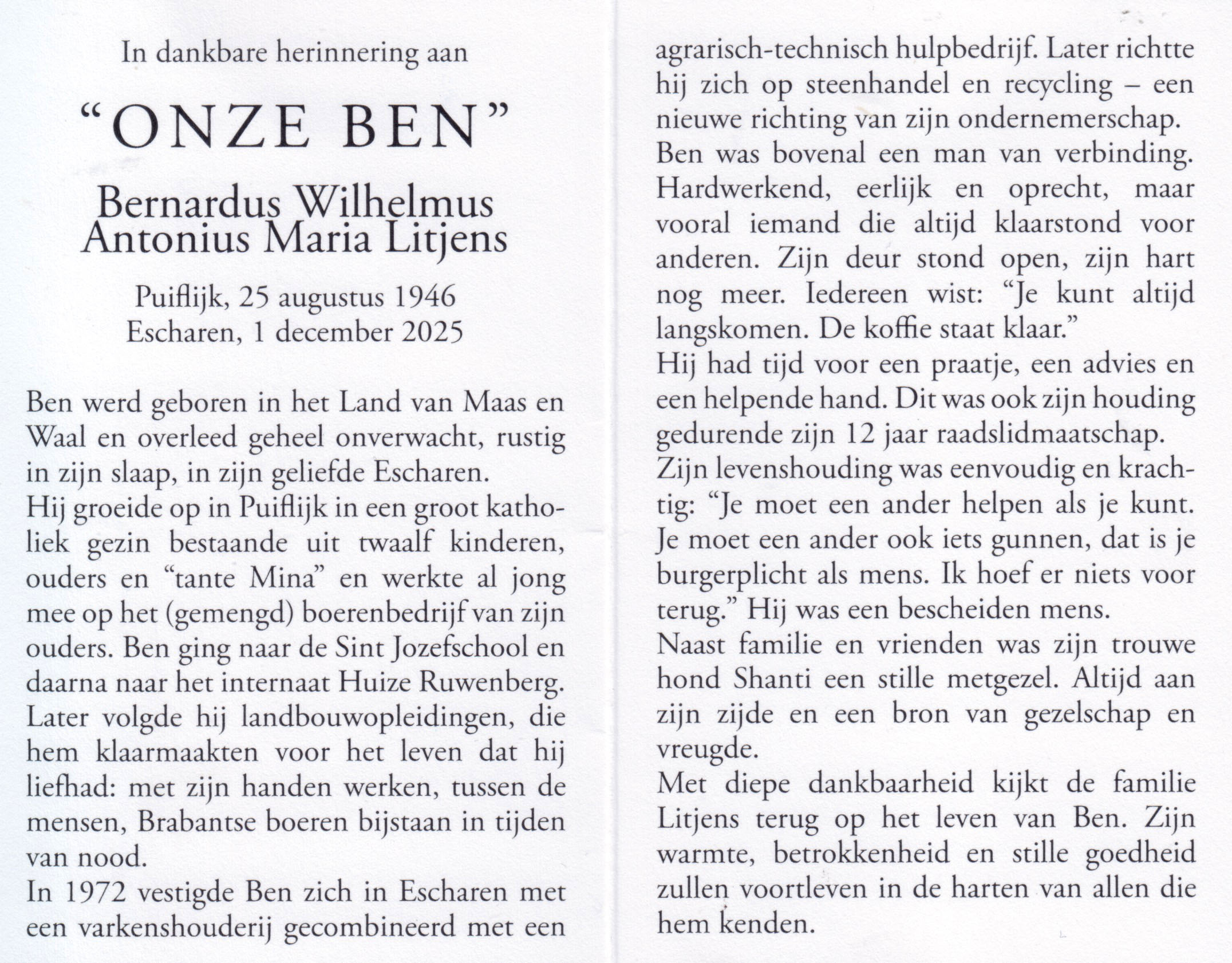 25-8-1946 1-12-2025 Litjens, Bernardus W.A.M. Doopnamen: Bernardus W.A.M. Roepnaam: Ben Achternaam: Litjens Geboren: 25-8-1946, Puiflijk Overleden: 1-12-2025, Escharen Leeftijd: 79 Archiefnummer: 20-3-6