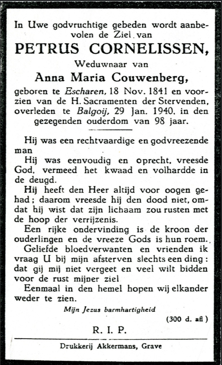 18-11-1841 29-1-1940 Cornelissen, Petrus Doopnamen: Petrus Achternaam: Cornelissen Geboren: 18-11-1841, Escharen Overleden: 29-1-1940, Balgoij Leeftijd: 98 Partner van: Anna Maria Couwenberg Archiefnummer: 20-5-1 k