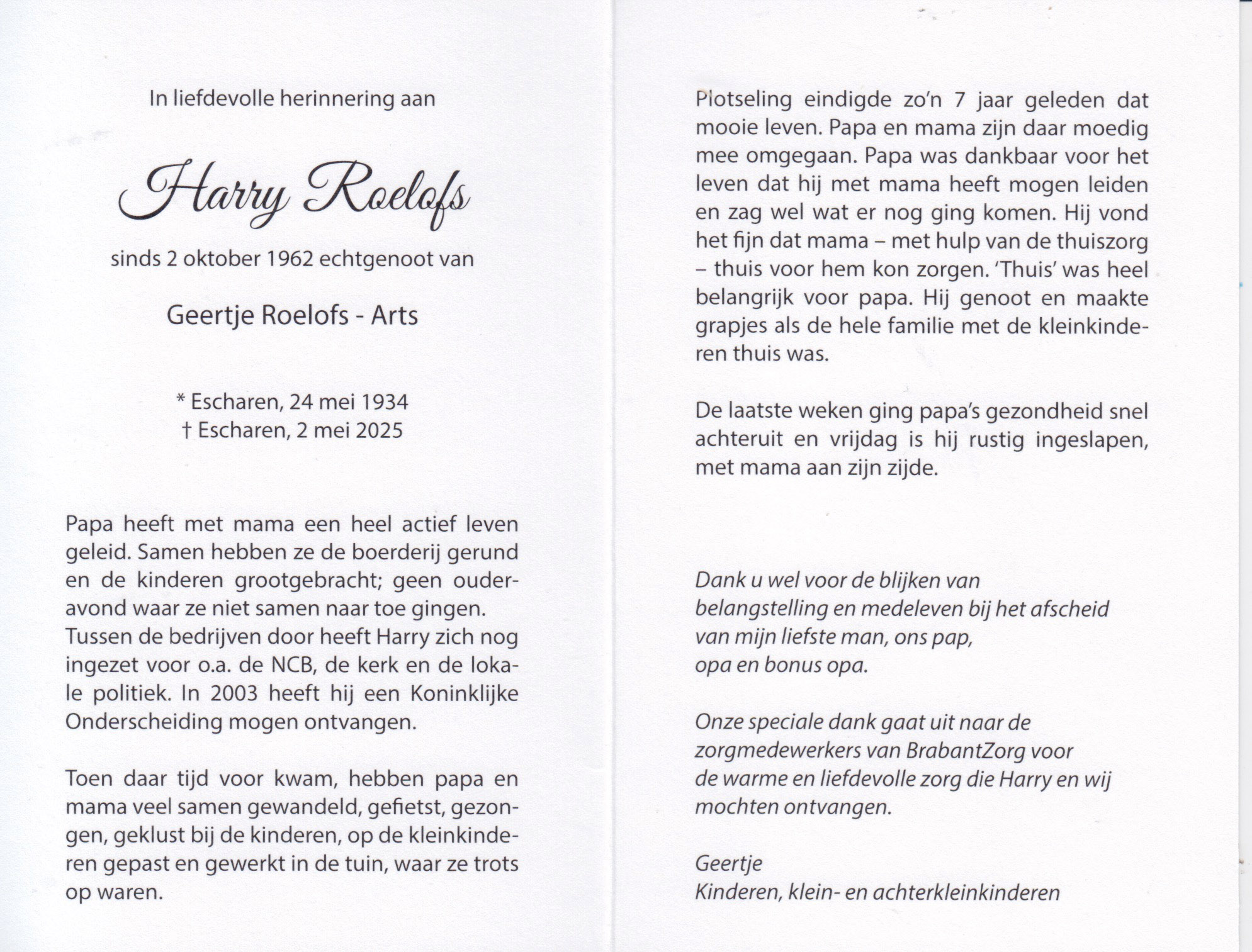 24-5-1934 2-5-2025 Roelofs, Harry Doopnamen: Harry Achternaam: Roelofs Geboren: 24-5-1934, Escharen Overleden: 2-5-2025, Escharen Leeftijd: 90 Partner van: Geertje Arts Archiefnummer: 20-7-4