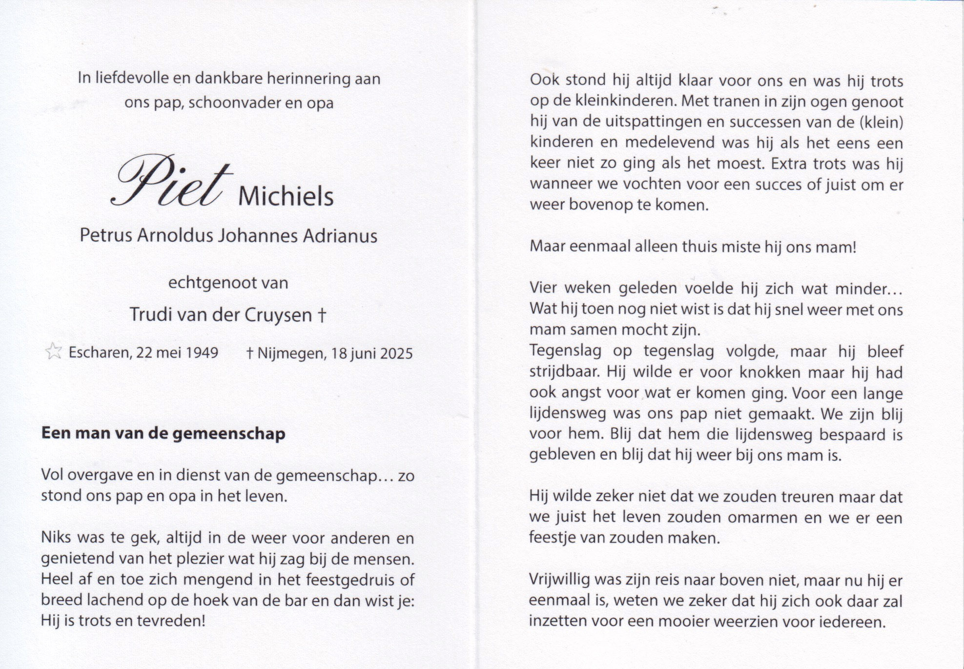 22-5-1949 18-6-2025 Michiels, Petrus Arnoldus J.A. Doopnamen: Petrus Arnoldus J.A. Roepnaam: Piet Achternaam: Michiels Geboren: 22-5-1949, Escharen Overleden: 18-6-2025, Nijmegen Leeftijd: 76 Partner van: Trudi van der Cruysen Archiefnummer: 20-8-2