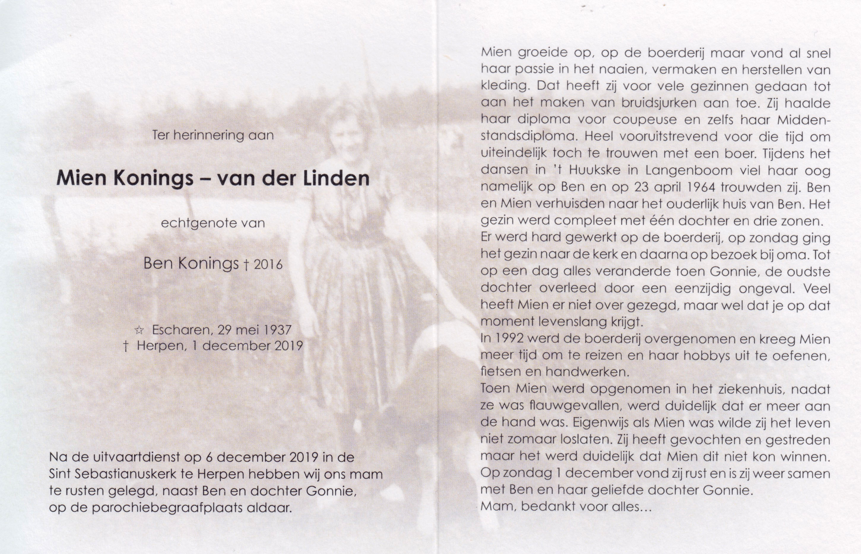 29-5-1937 1-12-2019 Linden, Mien van der Doopnamen: Mien Achternaam: van der Linden Geboren: 29-5-1937, Escharen Overleden: 1-12-2019, Herpen Leeftijd: 82 Partner van: Ben Konings Archiefnummer: 20-8-3