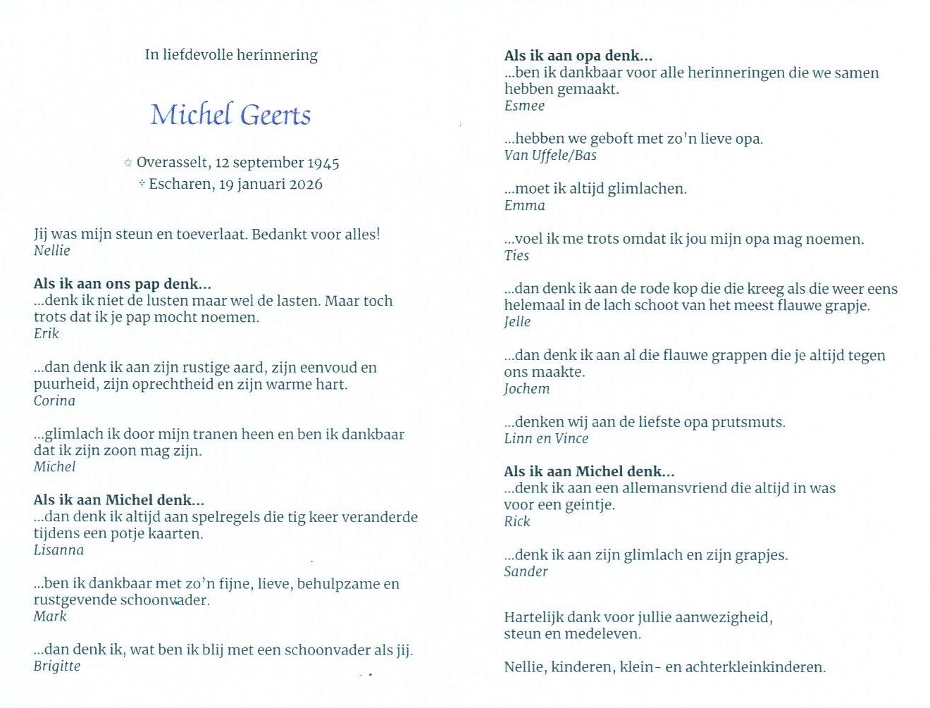 12-9-1945 19-1-2026 Geerts, Michel Doopnamen: Michel Achternaam: Geerts Geboren: 12-9-1945, Overasselt Overleden: 19-1-2026, Escharen Leeftijd: 80 Partner van: Nellie Archiefnummer: 20-9-3