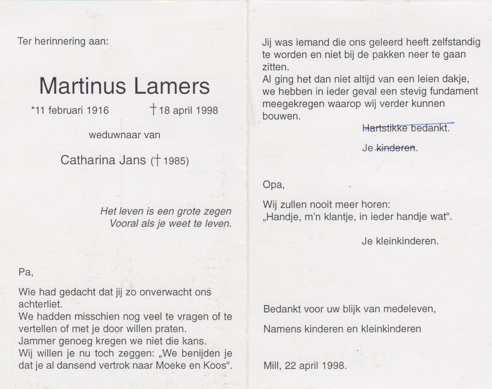 11-2-1916 18-4-1998 Lamers, Martinus Doopnamen: Martinus Achternaam: Lamers Geboren: 11-2-1916, Escharen Overleden: 18-4-1998, Mill Leeftijd: 69 Begrafenis/crematie te: Mill Partner van: Catharina Jans Archiefnummer: 3-10-2