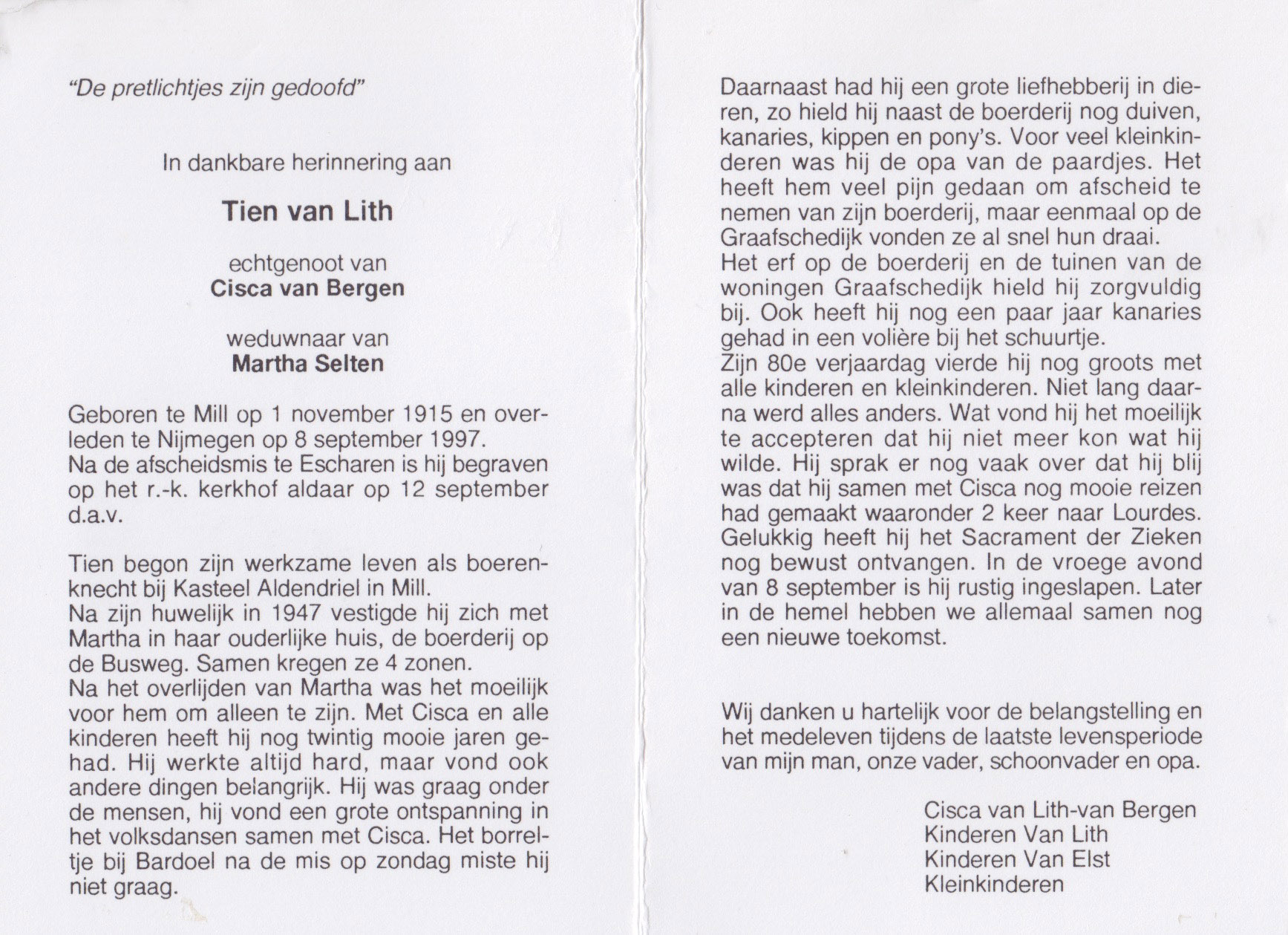 1-11-1915 8-9-1997 Lith, Martinus Wilhelmus van Doopnamen: Martinus Wilhelmus Roepnaam: Tien Achternaam: van Lith Geboren: 1-11-1915, Mill Overleden: 8-9-1997, Nijmegen Leeftijd: 81 Begrafenis/crematie te: Escharen Partner van: Cisca van Bergen Eerder gehuwd met: Martina P Selten Archiefnummer: 3-12-1 Terug