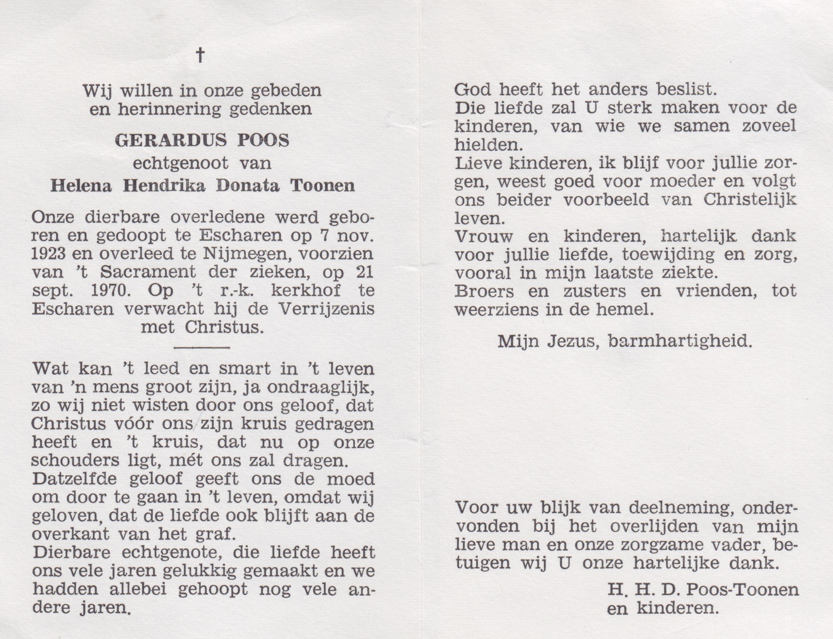 7-11-1923 21-9-1970 Poos, Gerardus Doopnamen: Gerardus Roepnaam: Gerrit Achternaam: Poos Geboren: 7-11-1923, Escharen Overleden: 21-9-1970, Nijmegen Leeftijd: 46 Begrafenis/crematie te: Escharen Partner van: Leen Toonen Archiefnummer: 3-20-2 Terug