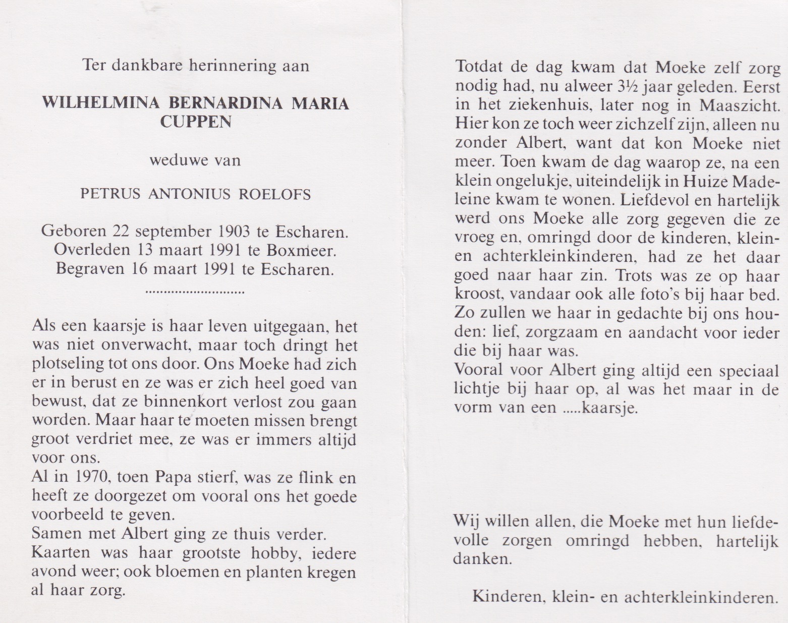 22-9-1903 13-3-1991 Cuppen, Wilhelmina Bernardina Maria Doopnamen: Wilhelmina Bernardina Maria Achternaam: Cuppen Geboren: 22-9-1903, Escharen Overleden: 13-3-1991, Boxmeer Leeftijd: 87 Begrafenis/crematie te: Escharen Partner van: Petrus A. Roelofs Archiefnummer: 3-23-6 Terug