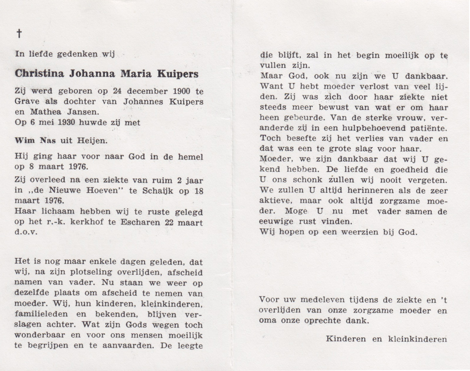 24-12-1900 18-3-1976 Kuipers, Christina Johanna Maria Doopnamen: Christina Johanna Maria Achternaam: Kuipers Geboren: 24-12-1900, Grave Overleden: 18-3-1976, Schaijk Leeftijd: 75 Begrafenis/crematie te: Escharen Partner van: Jacobus W. Nas Archiefnummer: 3-5-4