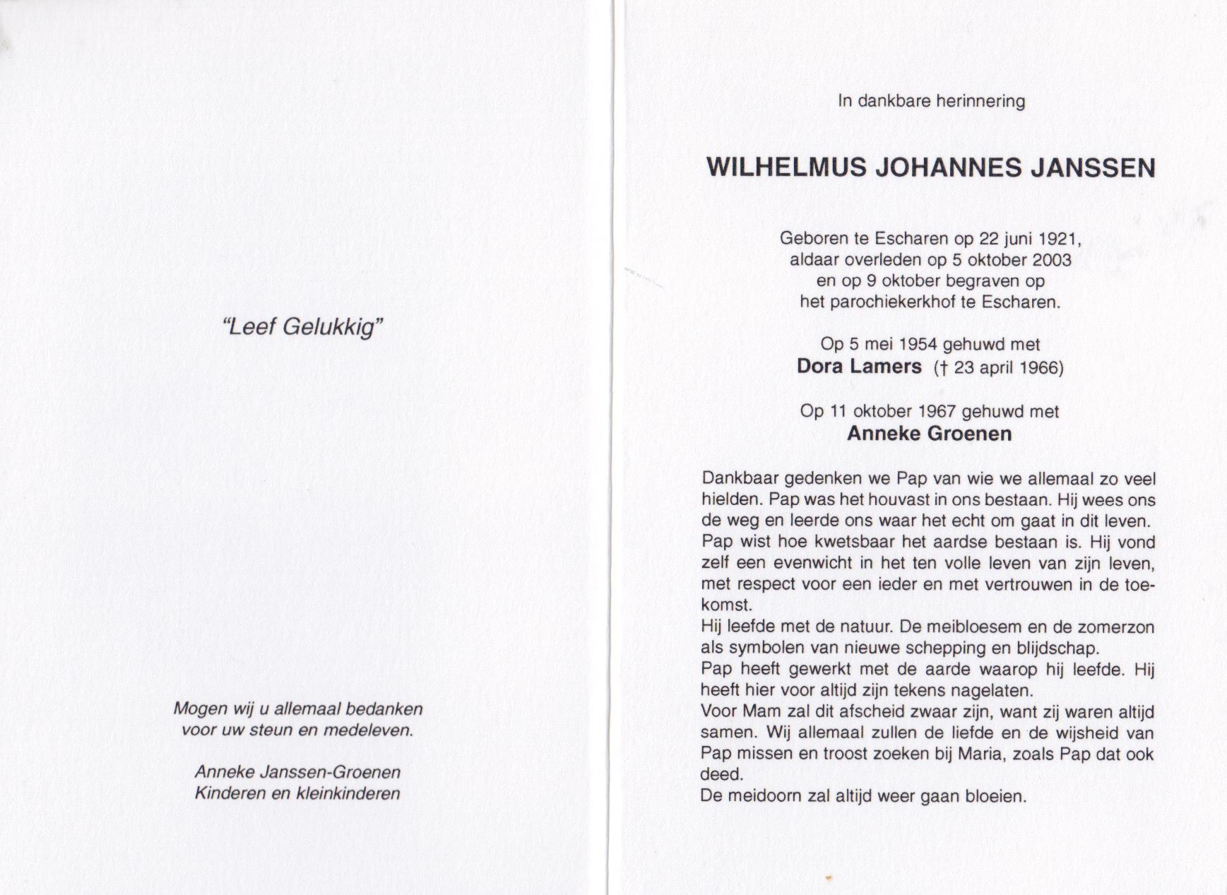 22-6-1921 5-10-2003 Janssen, Wilhelmus Johannes Doopnamen: Wilhelmus Johannes Achternaam: Janssen Geboren: 22-6-1921, Escharen Overleden: 5-10-2003, Escharen Leeftijd: 82 Begrafenis/crematie te: Escharen Partner van: Anneke Groenen Eerder gehuwd met: Theodora M.Lamers Archiefnummer: 3-6-2