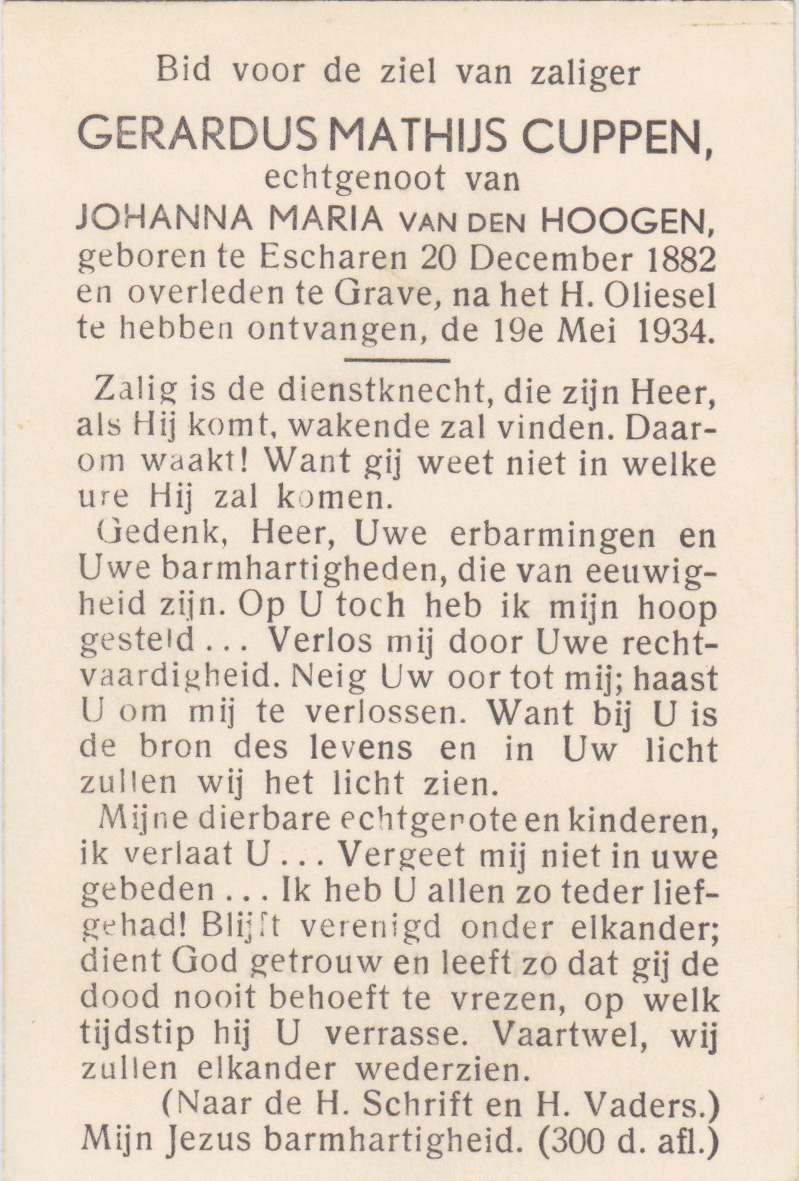 20-12-1882 19-5-1934 Cuppen, Gerardus Doopnamen: Gerardus Achternaam: Cuppen Geboren: 20-12-1882, Escharen Overleden: 19-5-1934, Grave Leeftijd: 51 Partner van: Johanna M. van den Hoogen Archiefnummer: 4.11.1