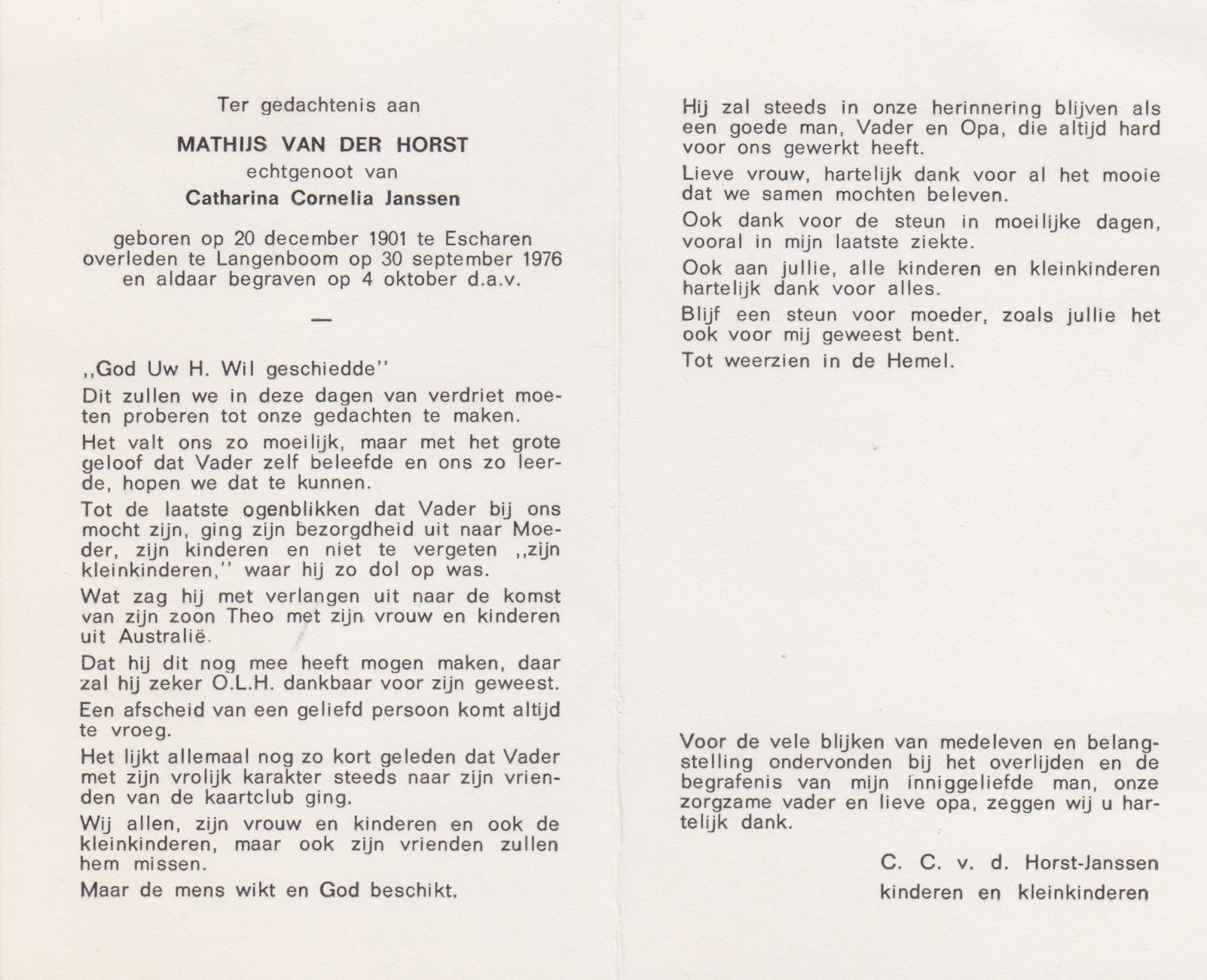 20-12-1901 20-9-1976 Horst, Mathijs van der Doopnamen: Mathijs Achternaam: van der Horst Geboren: 20-12-1901, Escharen Overleden: 20-9-1976, Langenboom Leeftijd: 74 Begrafenis/crematie te: Langenboom Partner van: Catharina C. Janssen Archiefnummer: 4.2.2