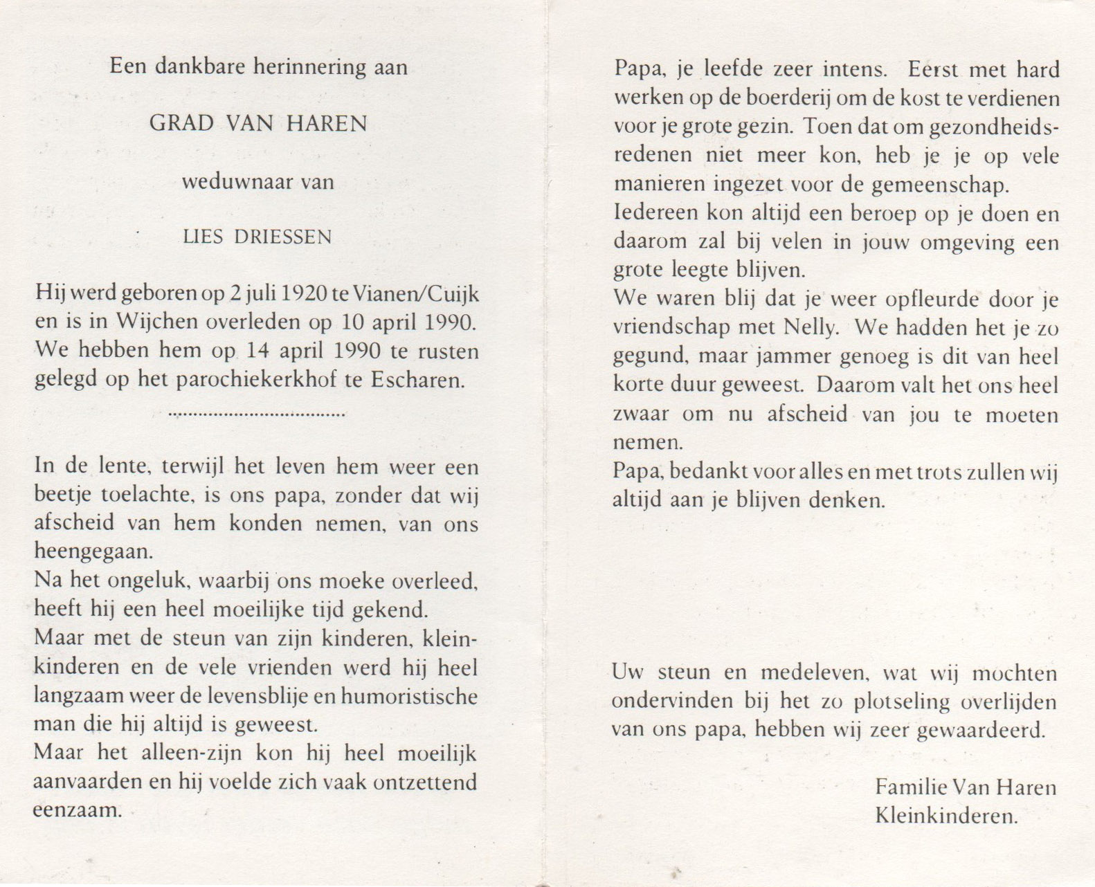 2-7-1920 10-4-1990 Haren, Grad van Doopnamen: Grad Roepnaam: Grad Achternaam: van Haren Geboren: 2-7-1920, Vianen/Cuijk Overleden: 10-4-1990, Wijchen Leeftijd: 69 Begrafenis/crematie te: Escharen Partner van: Lies Driessen Archiefnummer: 4.22.1