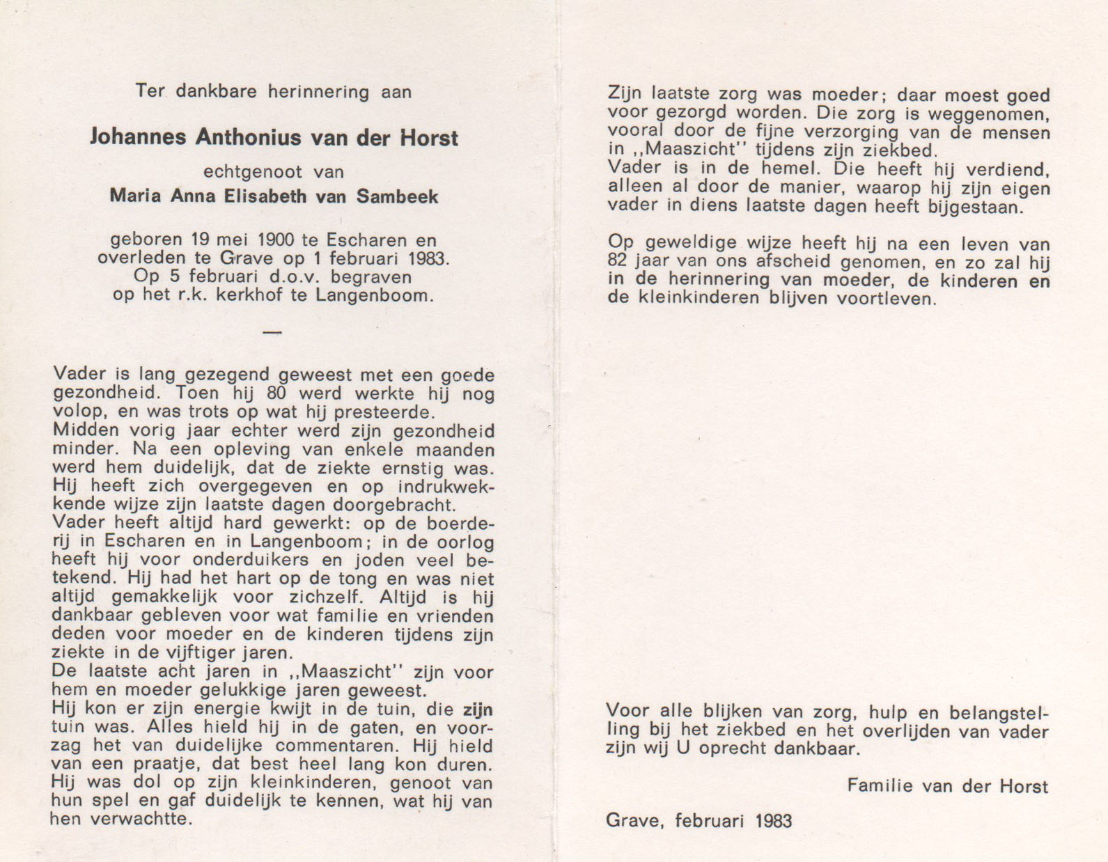19-5-1900 1-2-1983 Horst, Johannes Antonius van der Doopnamen: Johannes Antonius Achternaam: van der Horst Geboren: 19-5-1900, Escharen Overleden: 1-2-1983, Grave Leeftijd: 82 Begrafenis/crematie te: Langenboom Partner van: Maria A.E. van Sambeek Archiefnummer: 4.4.3