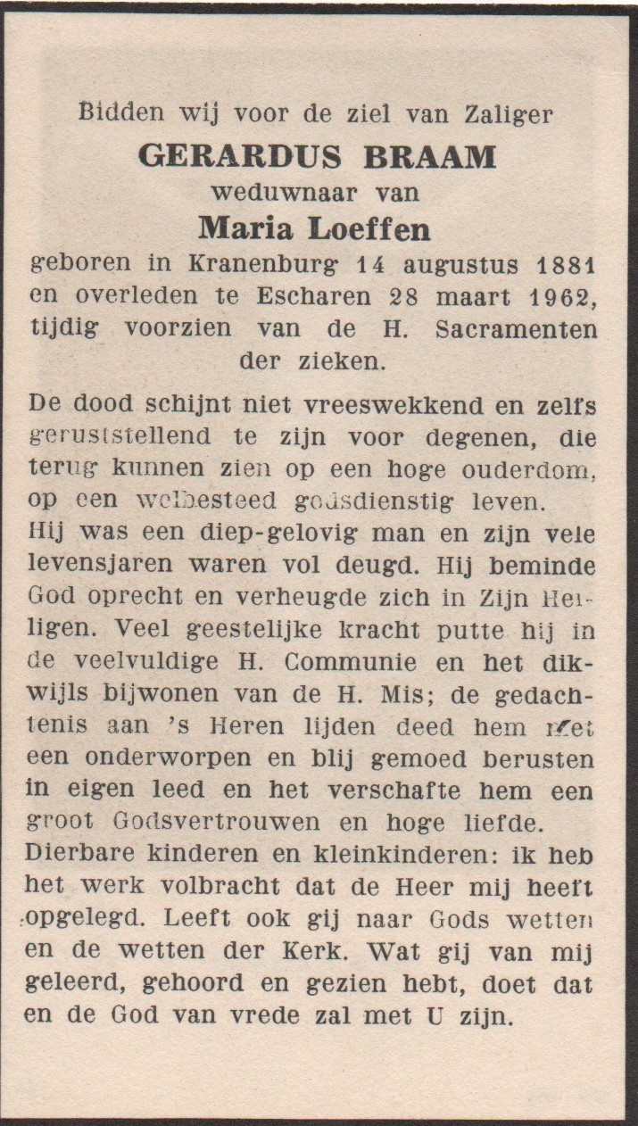 14-8-1881 28-3-1962 Braam, Gerardus Doopnamen: Gerardus Achternaam: Braam Geboren: 14-8-1881, Kranenburg Overleden: 28-3-1962, Escharen Leeftijd: 80 Begrafenis/crematie te: Escharen Partner van: Maria Loeffen Archiefnummer: 4.15.3 Terug