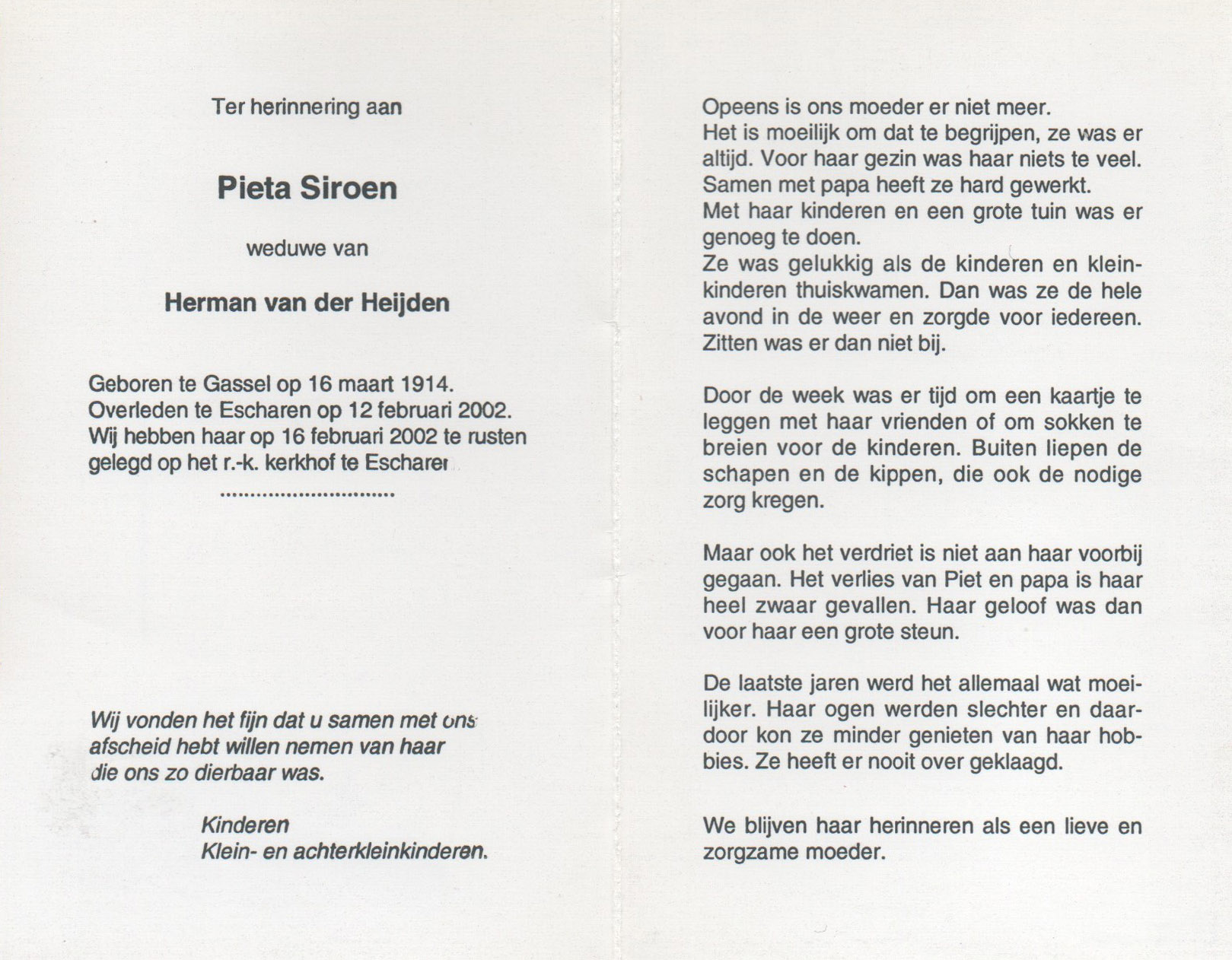 16-3-1914 12-2-2002 Siroen, Pieta Doopnamen: Pieta Roepnaam: Pieta Achternaam: Siroen Geboren: 16-3-1914, Gassel Overleden: 12-2-2002, Escharen Leeftijd: 87 Begrafenis/crematie te: Escharen Partner van: Herman van der Heijden Archiefnummer: 4.7.4 Terug