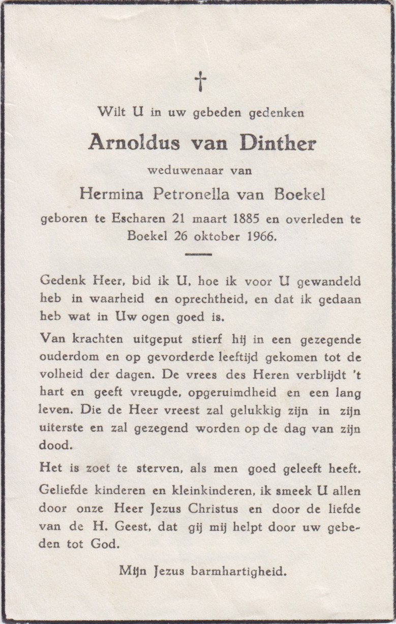 21-3-1885 26-10-1966 Dinther, Arnoldus van Doopnamen: Arnoldus Achternaam: van Dinther Geboren: 21-3-1885, Escharen Overleden: 26-10-1966, Boekel Leeftijd: 81 Begrafenis/crematie te: Escharen Partner van: Hermina Petronella van Boekel Archiefnummer: 5.11.3 Terug