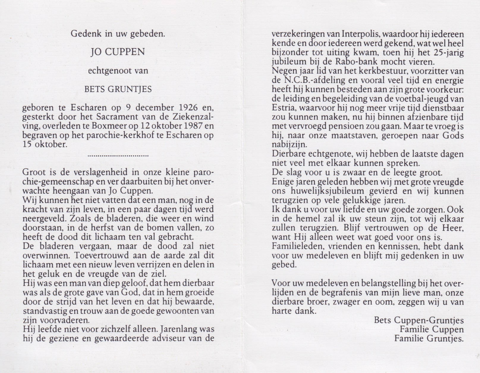 9-12-1926 12-10-1987 Cuppen, Johannes Martinus Doopnamen: Johannes Martinus Roepnaam: Jo Achternaam: Cuppen Geboren: 9-12-1926, Escharen Overleden: 12-10-1987, Boxmeer Leeftijd: 60 Begrafenis/crematie te: Escharen Partner van: Bets Gruntjes Archiefnummer: 5.19.3