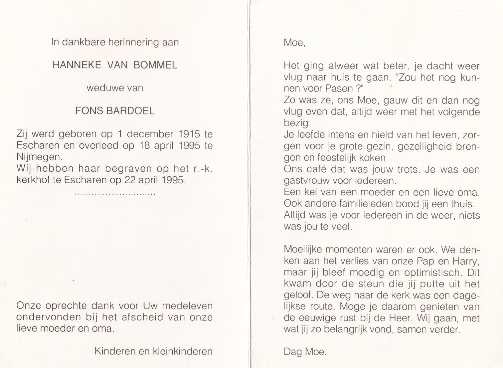 1-12-1915 22-4-1995 Bommel, Hanneke van Doopnamen: Hanneke Roepnaam: Hanneke Achternaam: van Bommel Geboren: 1-12-1915, Escharen Overleden: 22-4-1995, Nijmegen Leeftijd: 79 Begrafenis/crematie te: Escharen Partner van: Fons Bardoel Archiefnummer: 5.2.4