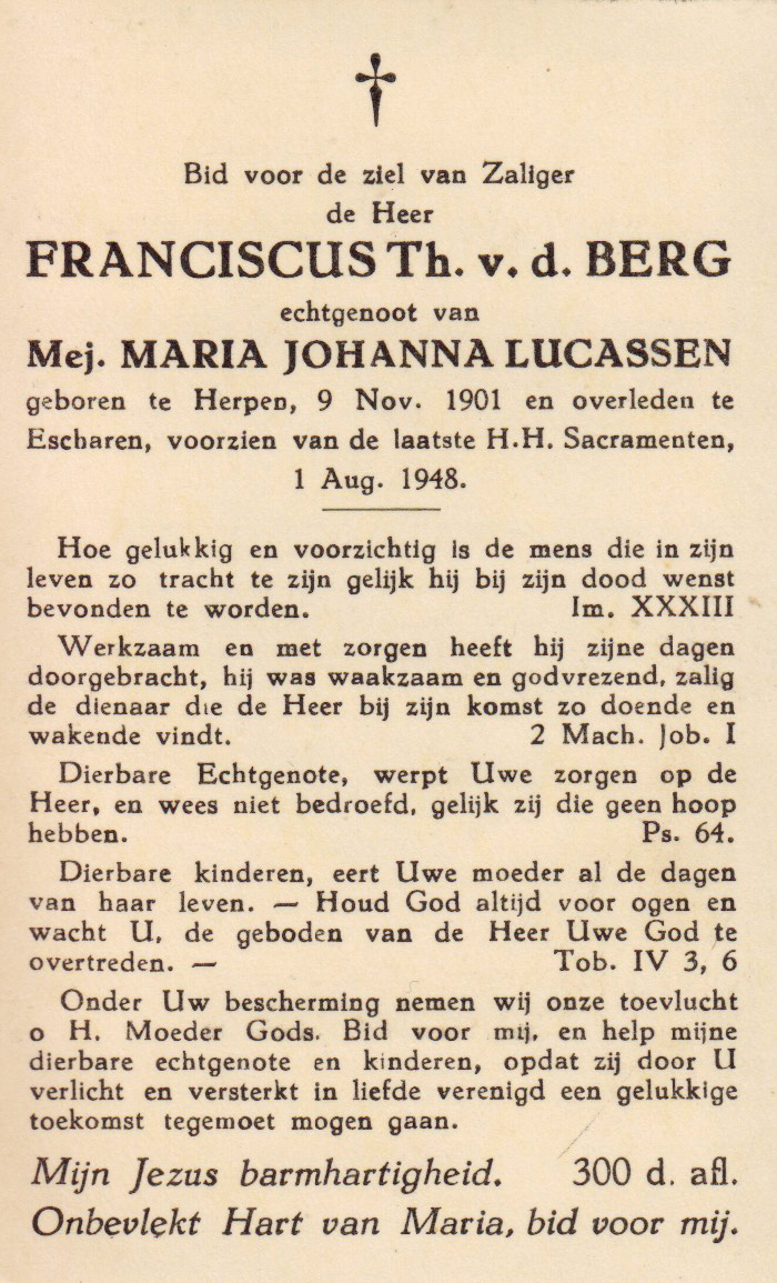 9-11-1901 1-8-1948 Berg, Franciscus Theodorus van den Doopnamen: Franciscus Theodorus Roepnaam: Frans Achternaam: van den Berg Geboren: 9-11-1901, Herpen Overleden: 1-8-1948, Escharen Leeftijd: 46 Begrafenis/crematie te: Escharen Partner van: Maria Johanna Lukassen Archiefnummer: 5.3.1 Terug